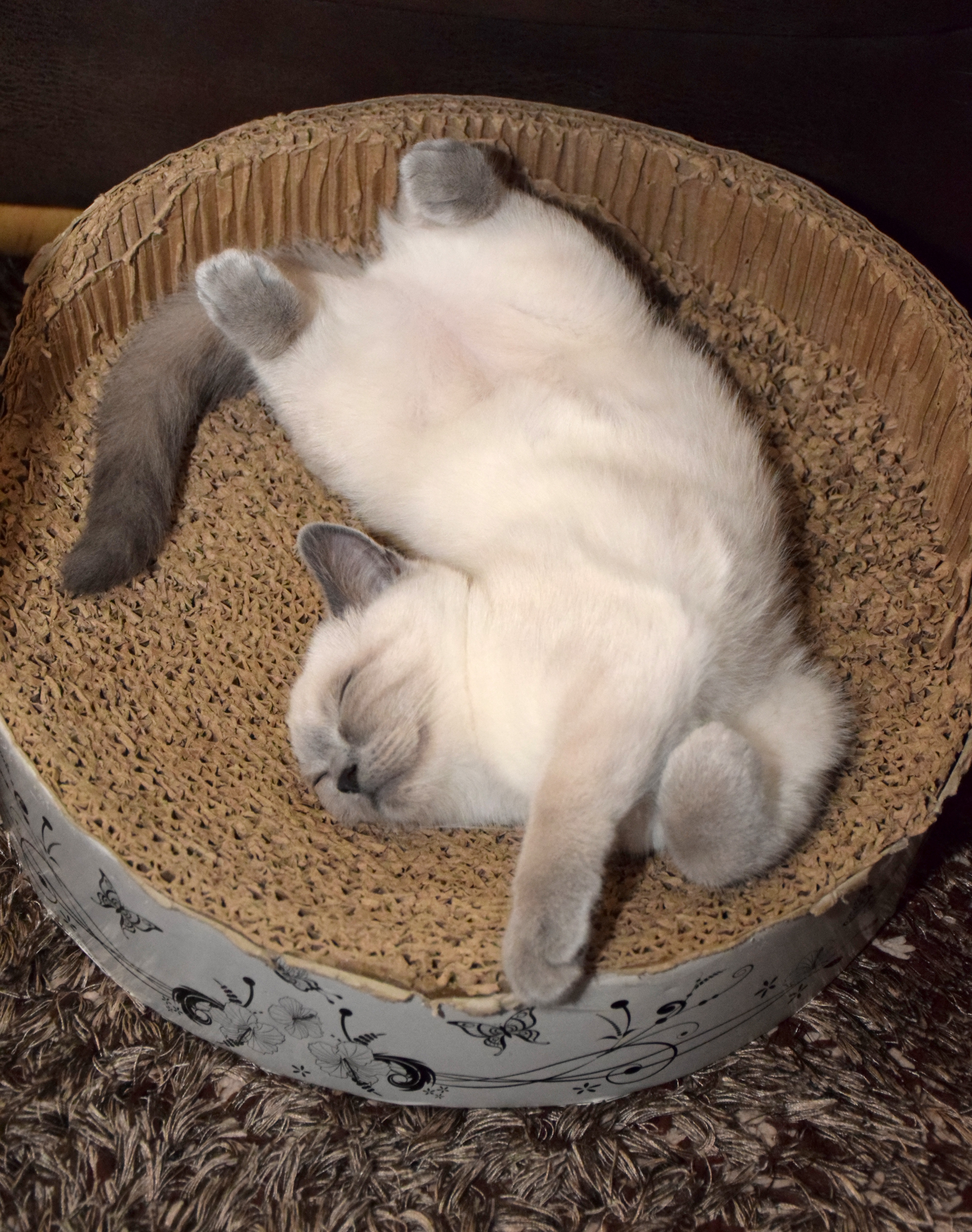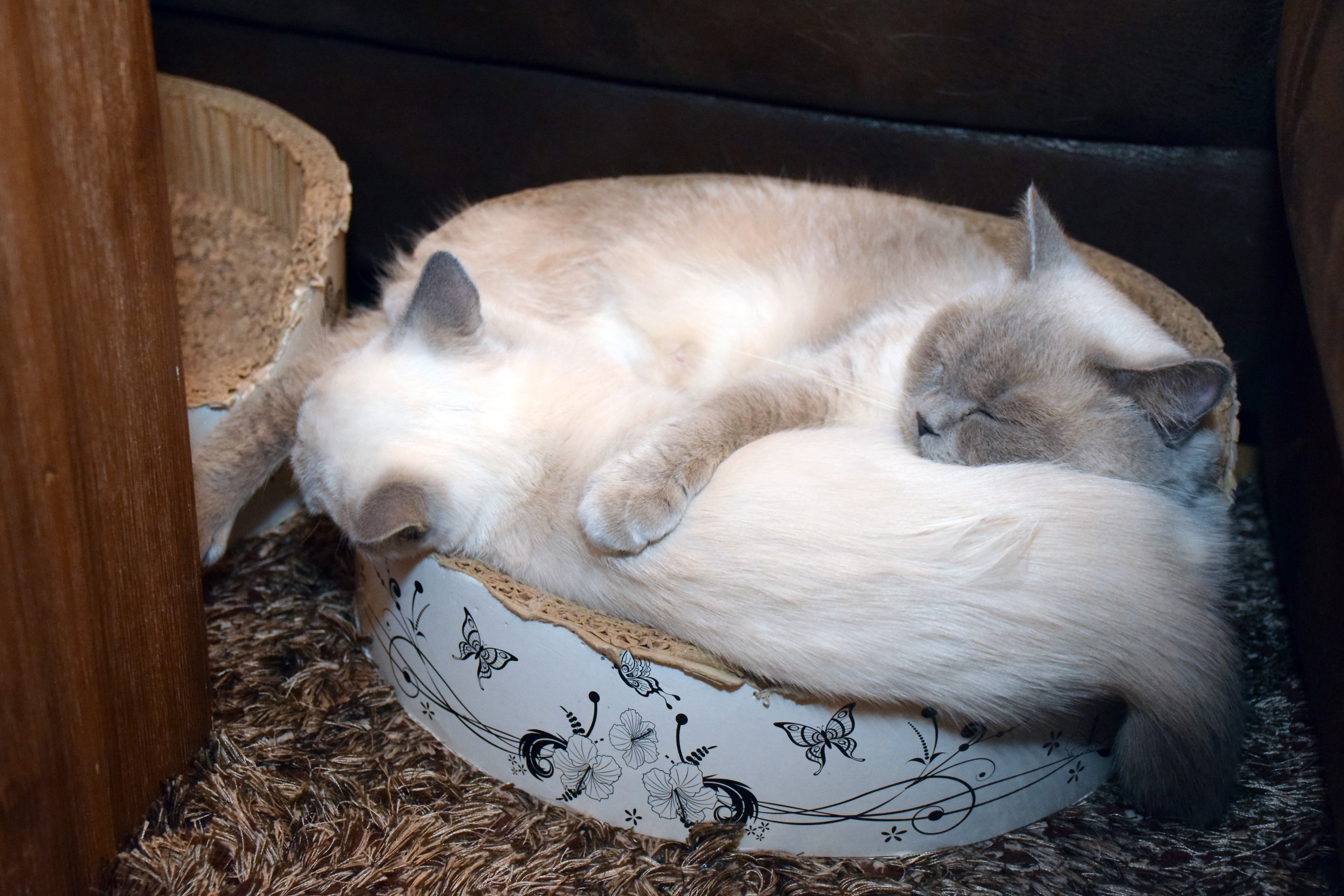 Nou zou je toch denken dat een kittenkrabtonnetje niet de ruimte biedt om mama en haar vier kleintjes een slaapplek te bieden, maar dit nest bewijst het tegendeel. Soms hoor je wel een “skrieuw”, omdat mama een van de kleintjes plet, maar over het algemeen gaat het prima. En wordt het te warm of te druk, och dan kruip je er half uit en ga je op de rand van de bench liggen…