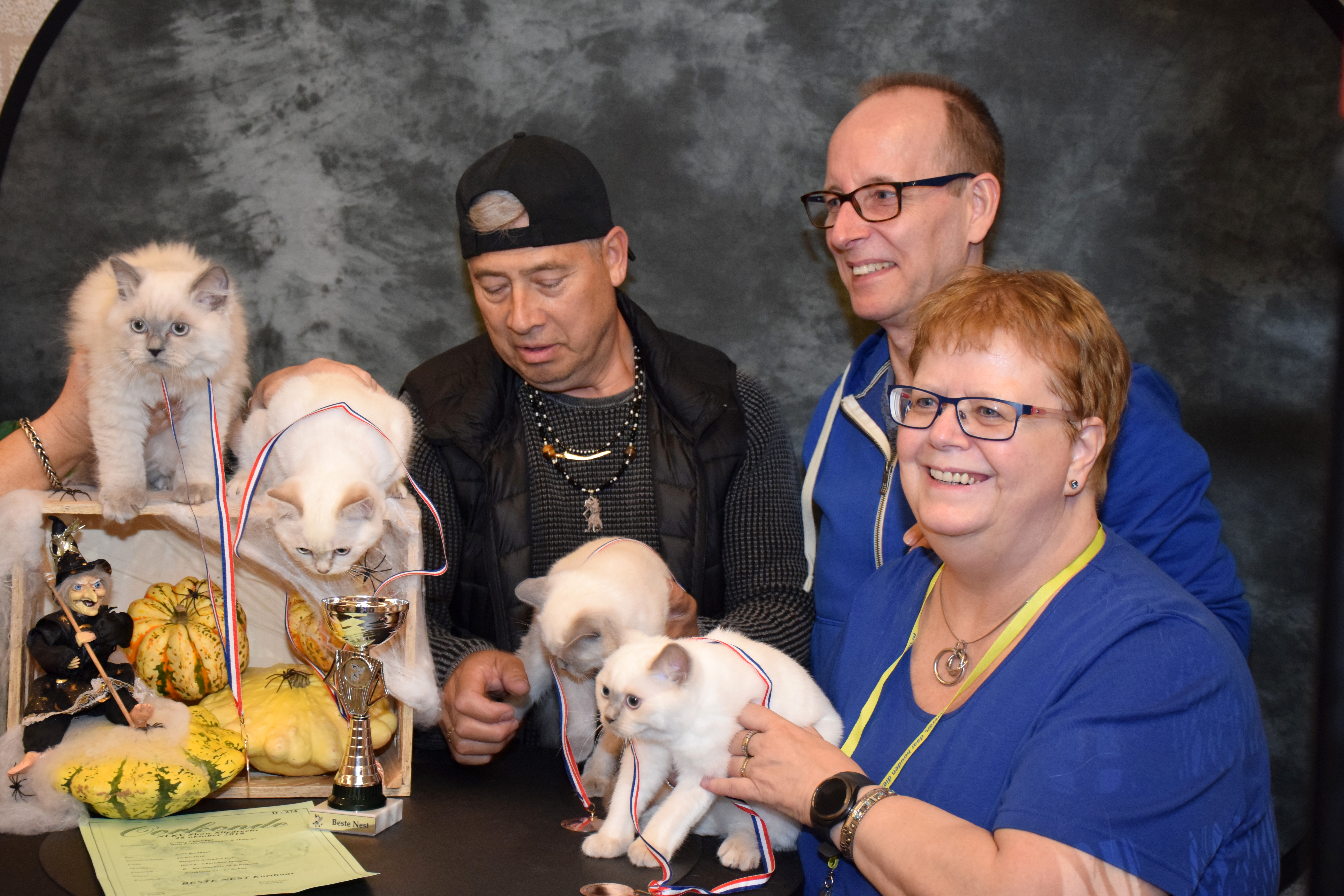 En dan… Showtime. De veterinaire keuring is geen probleem. De dierenarts vindt ze geweldig. Nadat we de kooien hebben ingericht en de kittens er in hebben gezet, denken we.. dit wordt hem niet… de kittens stuiteren door de kooi! Dus zetten we de Relax-o-Cat maar aan en even later worden ze rustiger. We hoeven niet lang te wachten, voordat we naar de keurruimte moeten. Cora Swierts bekijkt alle kittens zorgvuldig en keurt ze allemaal goed. Ze krijgen een mooie EX1 op hun rapport en een hartje van de keurmeester. Eenmaal terug worden we al snel op het podium verzocht. Ze zijn het Beste Nest Korthaar!! Dit hadden we niet verwacht, maar we zijn superblij! Ze krijgen allemaal een mooie medaille omgehangen en er wordt een foto gemaakt. Maar ja, of die gelukt is, weet ik nog niet, want het valt niet mee om vier kittens tegelijk naar de camera te laten kijken… 🙂