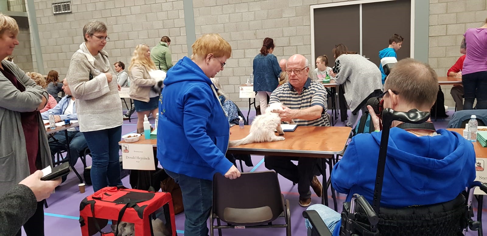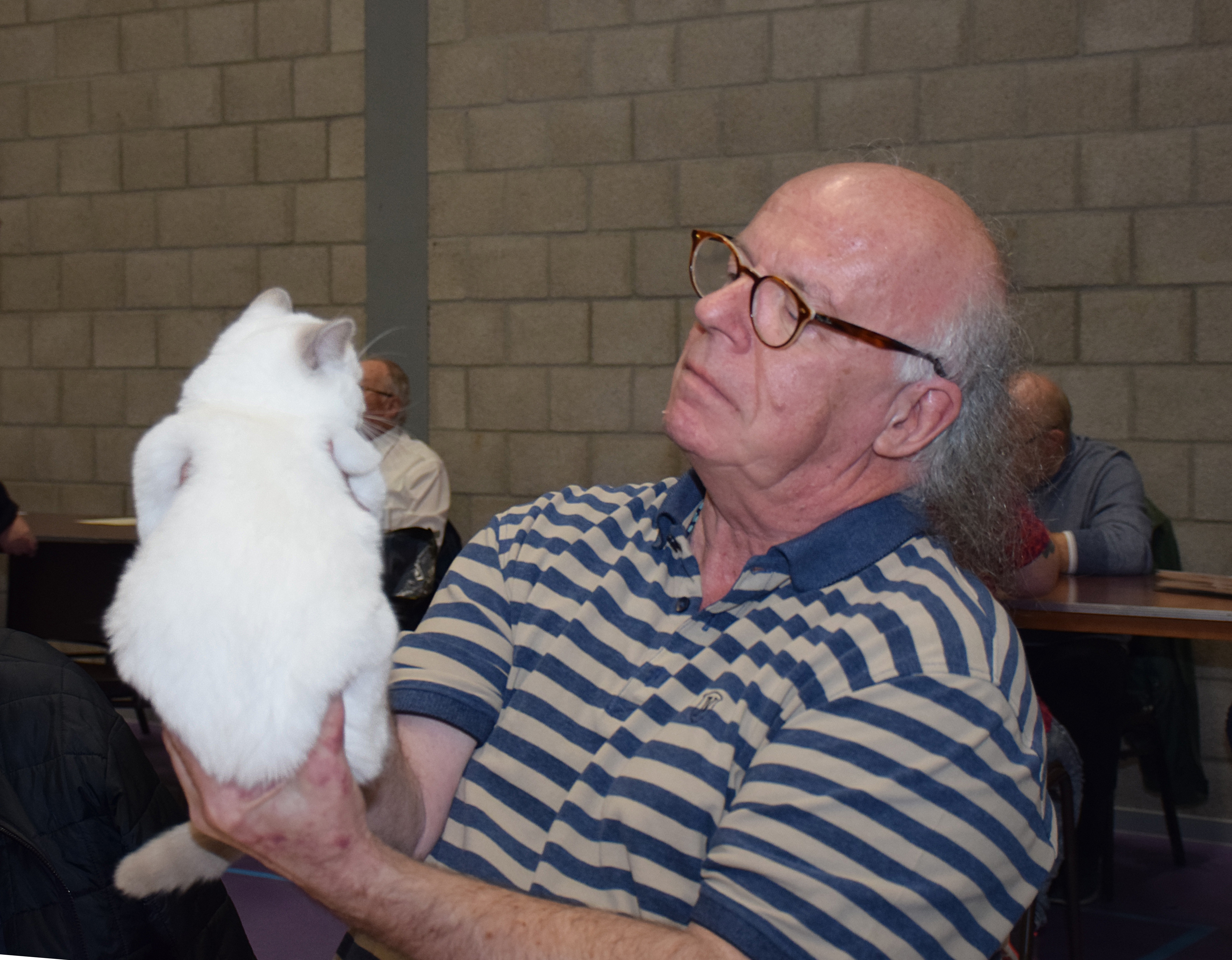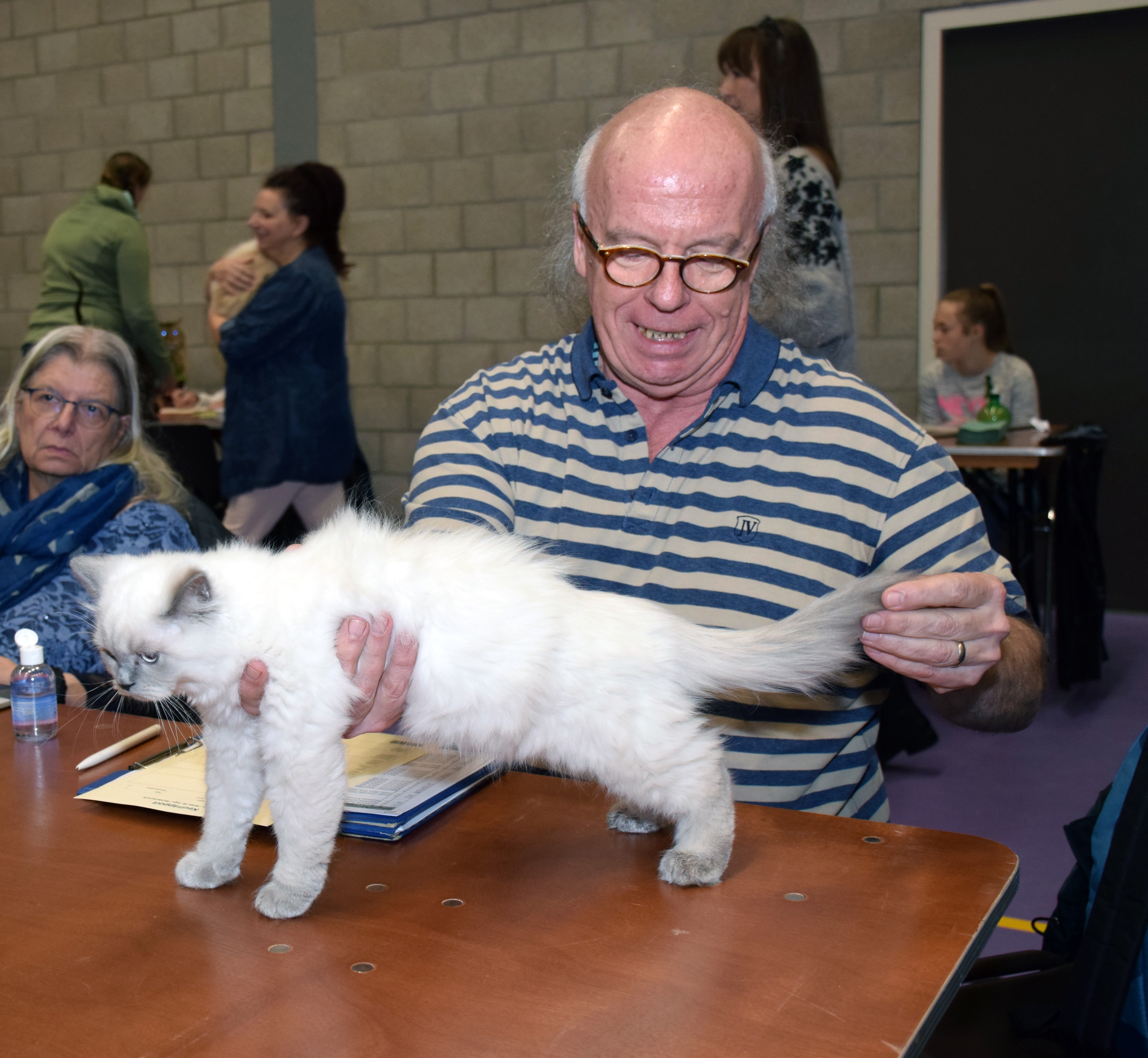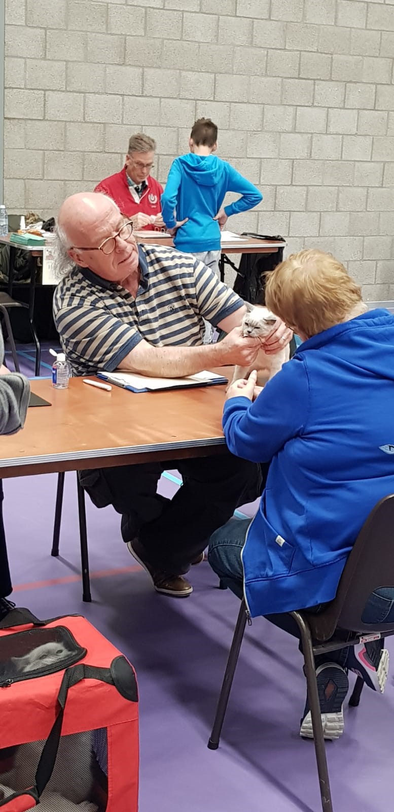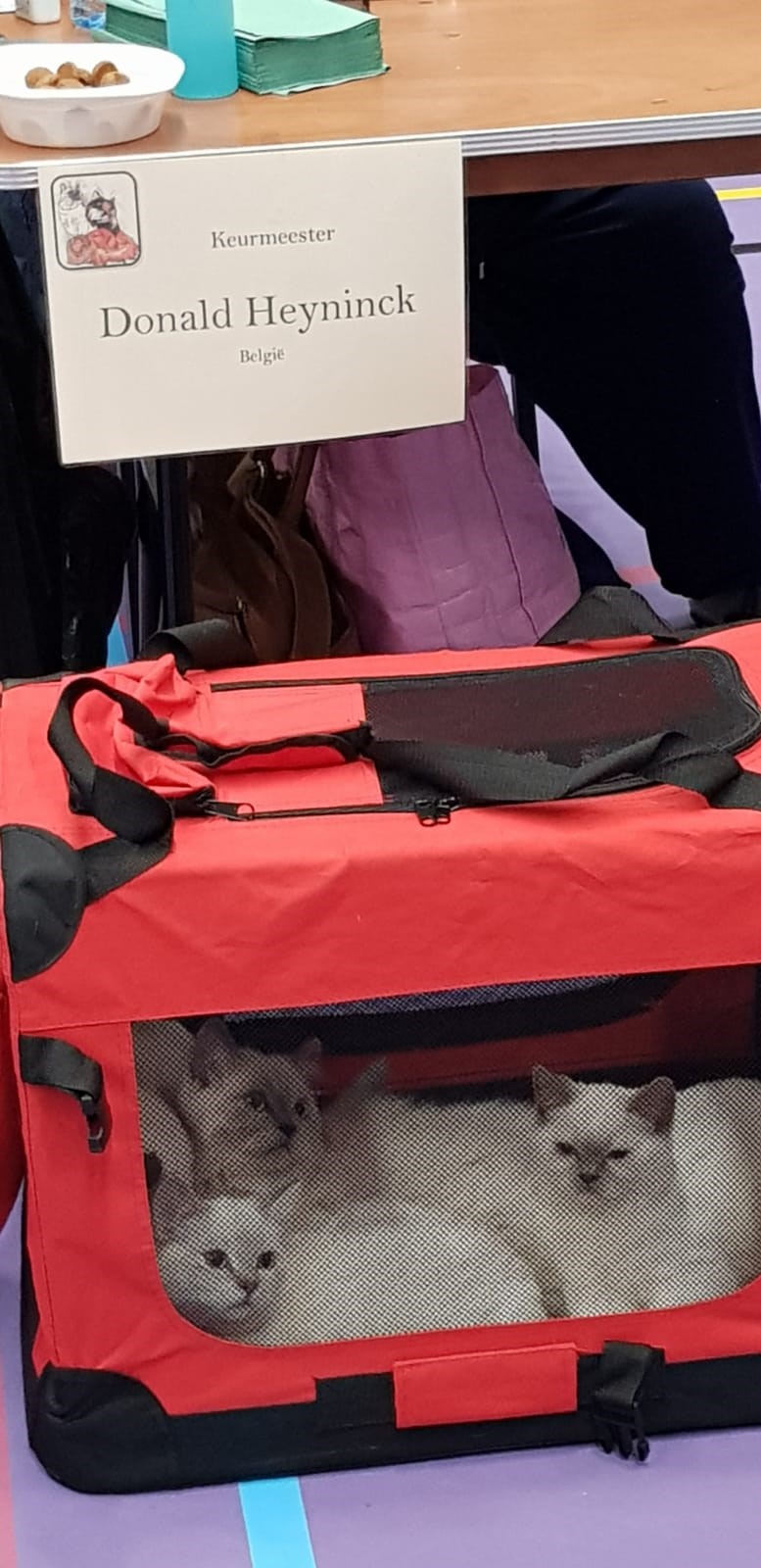 En dan is het zover, zondagmorgen vroeg naar Helden-Panningen. Lekker op tijd daar en al snel, nadat de show geopend is, mag het nest naar de keurruimte. Donald Heyninck is zeer lovend over de kittens en vindt, dat als je dan toch een “foutje” in het nest hebt, dit toch wel een heel mooi “foutje” is, daarmee duidend op Myron Micky, het enige Langhaartje in dit nest. Het nest krijgt de tweede plek van de drie nestjes kortharen. Niet slecht!