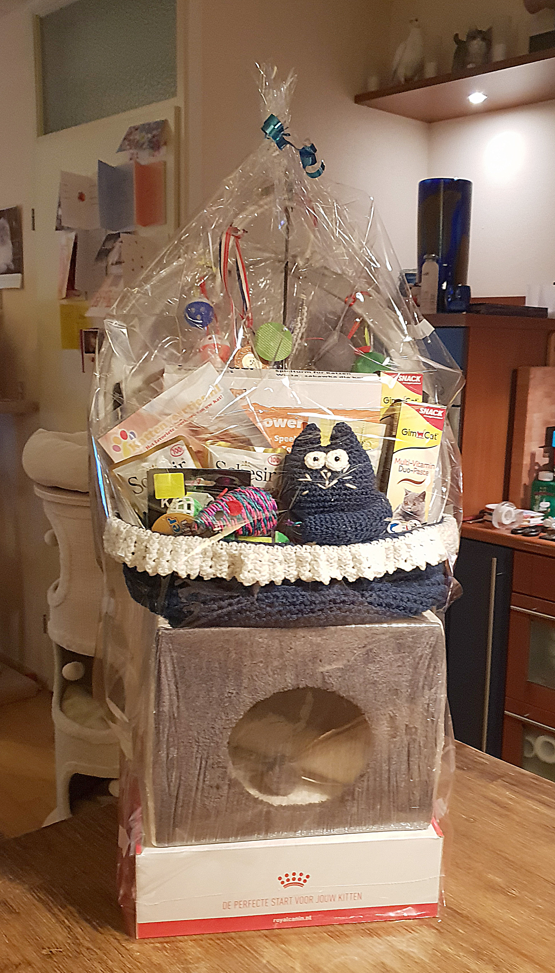 Dinsdag is het dan zover. Om vijf uur ’s middags gaan we naar Sabine, Miley en het kittenpakket. Igor heeft geregeld dat ze thuis zijn en gezorgd dat hij niet in de buurt is als de bel gaat. Sabine maakt open, ziet ons, ziet het mandje en tranen van verbijstering en geluk rollen over haar wangen, terwijl ze alleen maar kan uitbrengen: “Nee… echt?” Ja, echt…. Wat heerlijk om iemand zo gelukkig te zien en ja… emo-tante die ik ben… bij mij staan de tranen ook in mijn ogen… 🙂