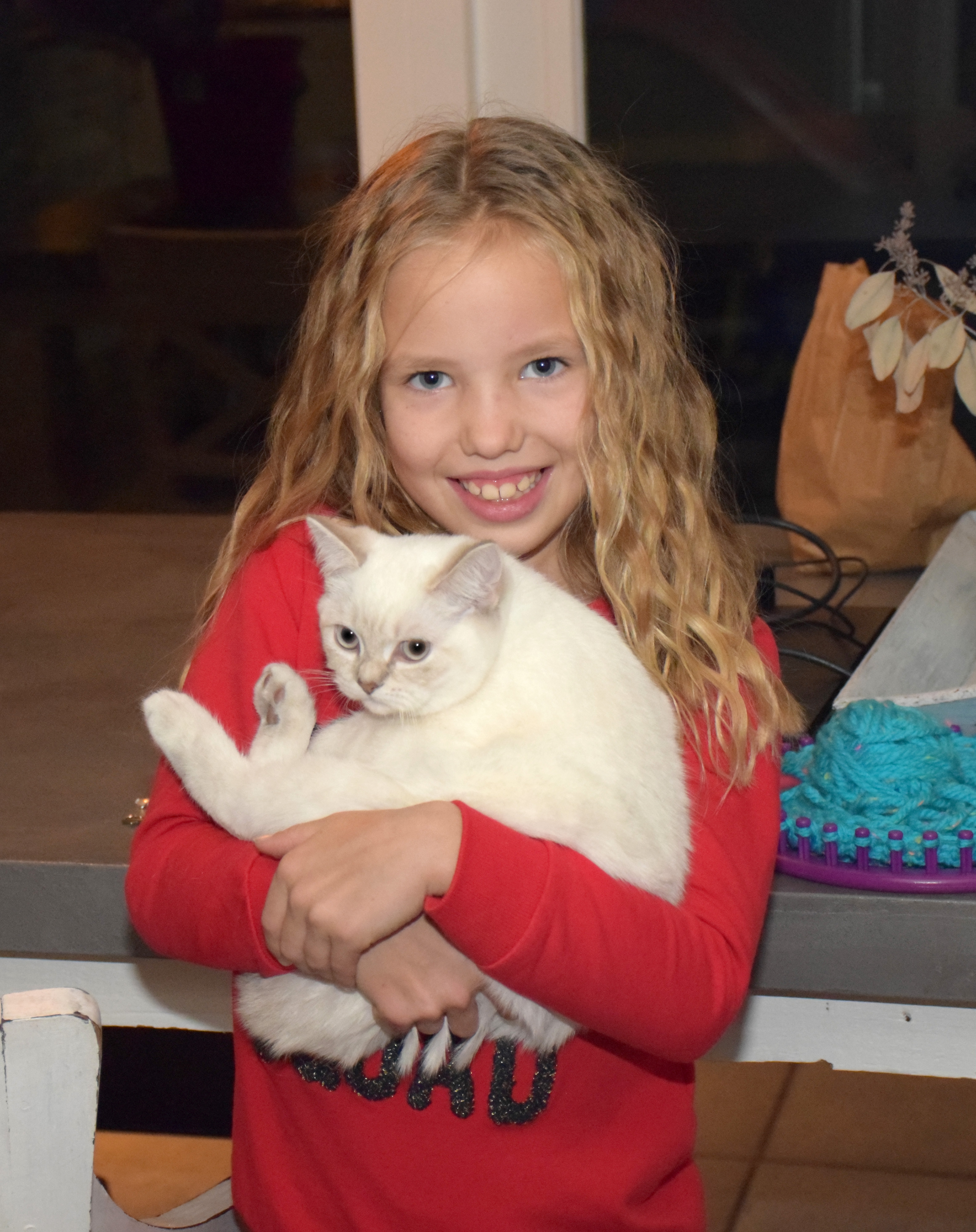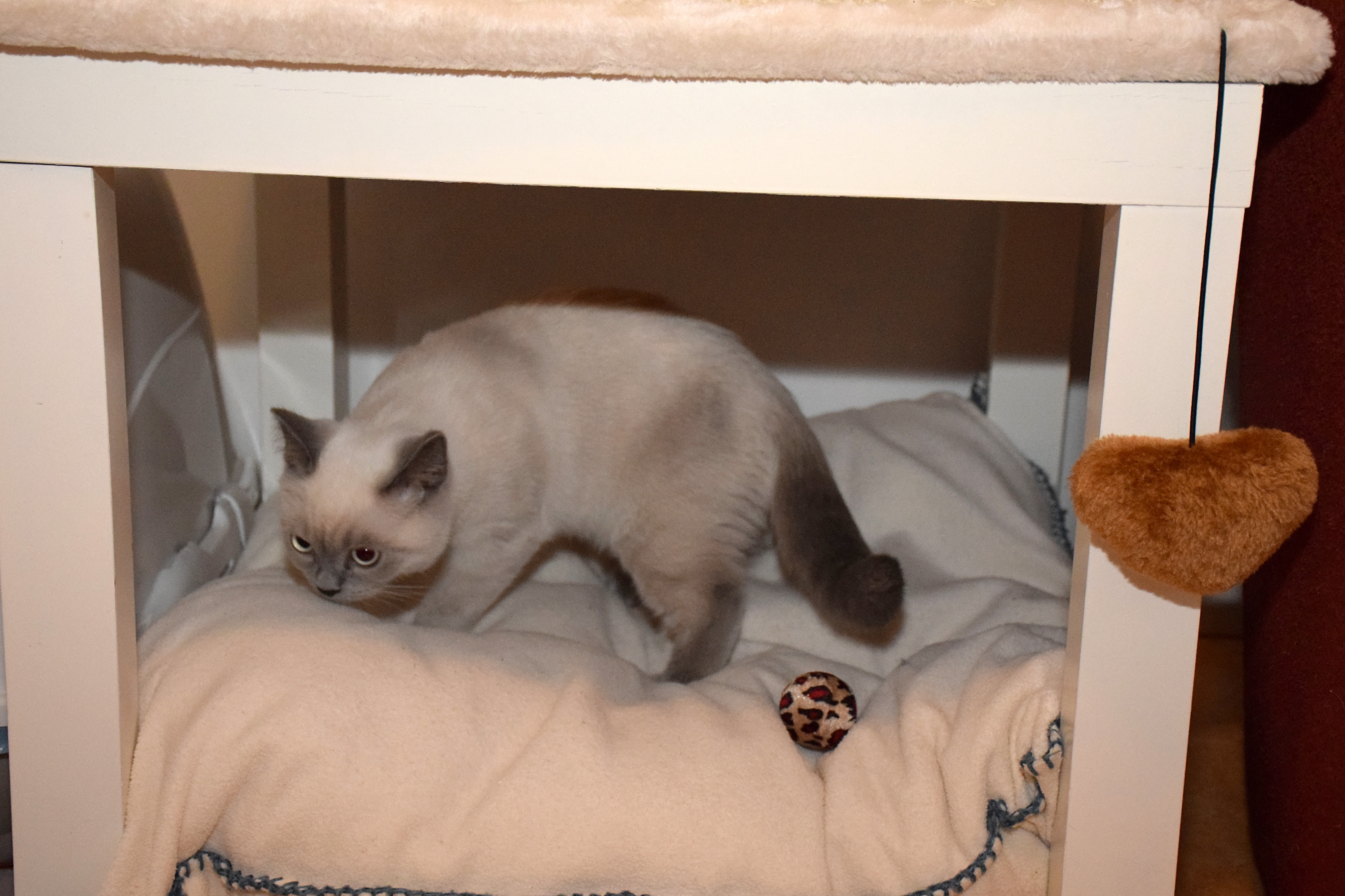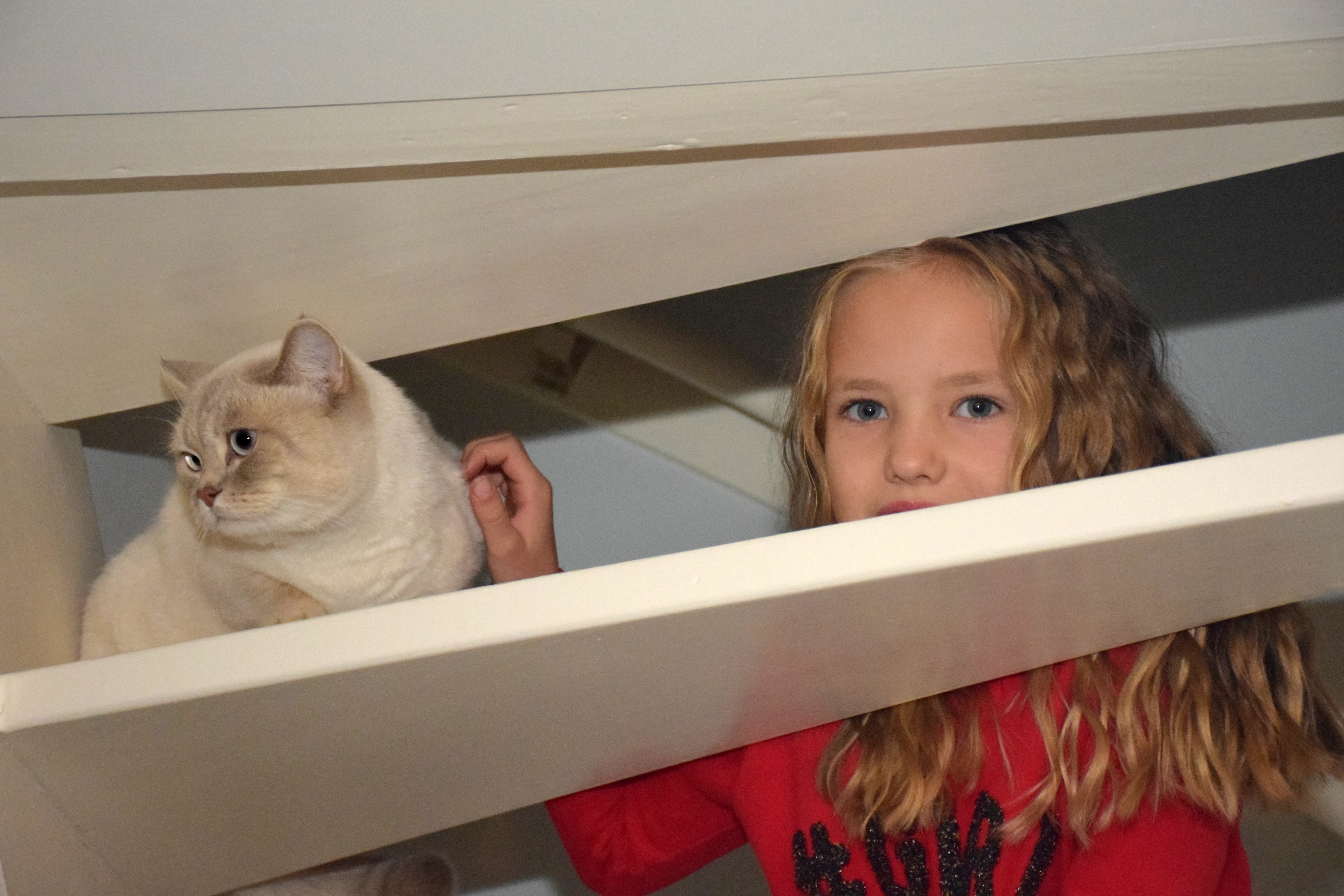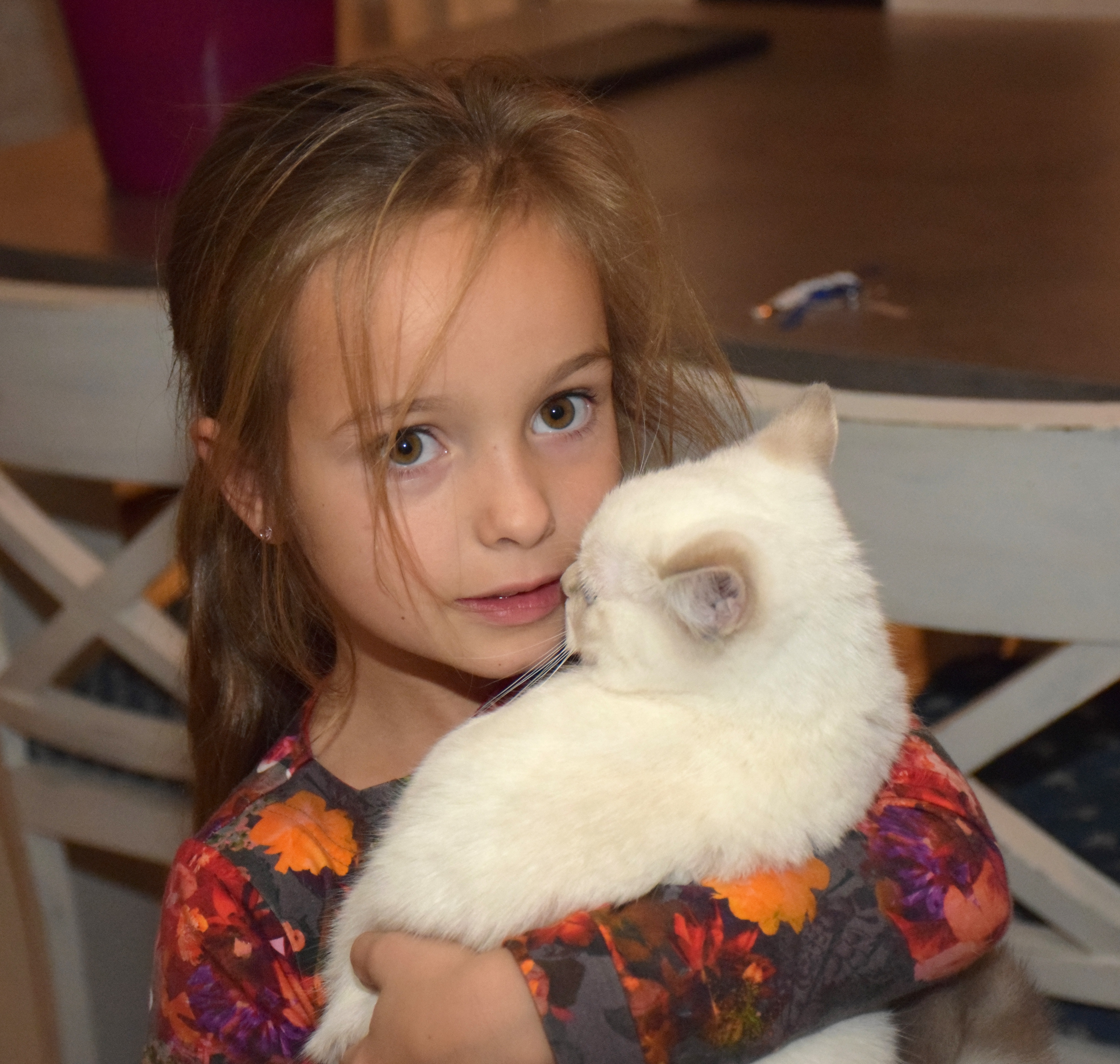 Miley is al snel haar mandje uit en gaat op verkenning. Whiskers vindt het maar niets en ligt in eerste instantie onder de bank naar haar te blazen, maar later zit hij op de trap naar haar te gluren. Zijn nieuwsgierigheid is gewekt. Miley heeft een plekje op een stoel gevonden en de kinderen zijn al snel met haar aan het kroelen. Dit komt weer goed… ze is hier zo welkom!