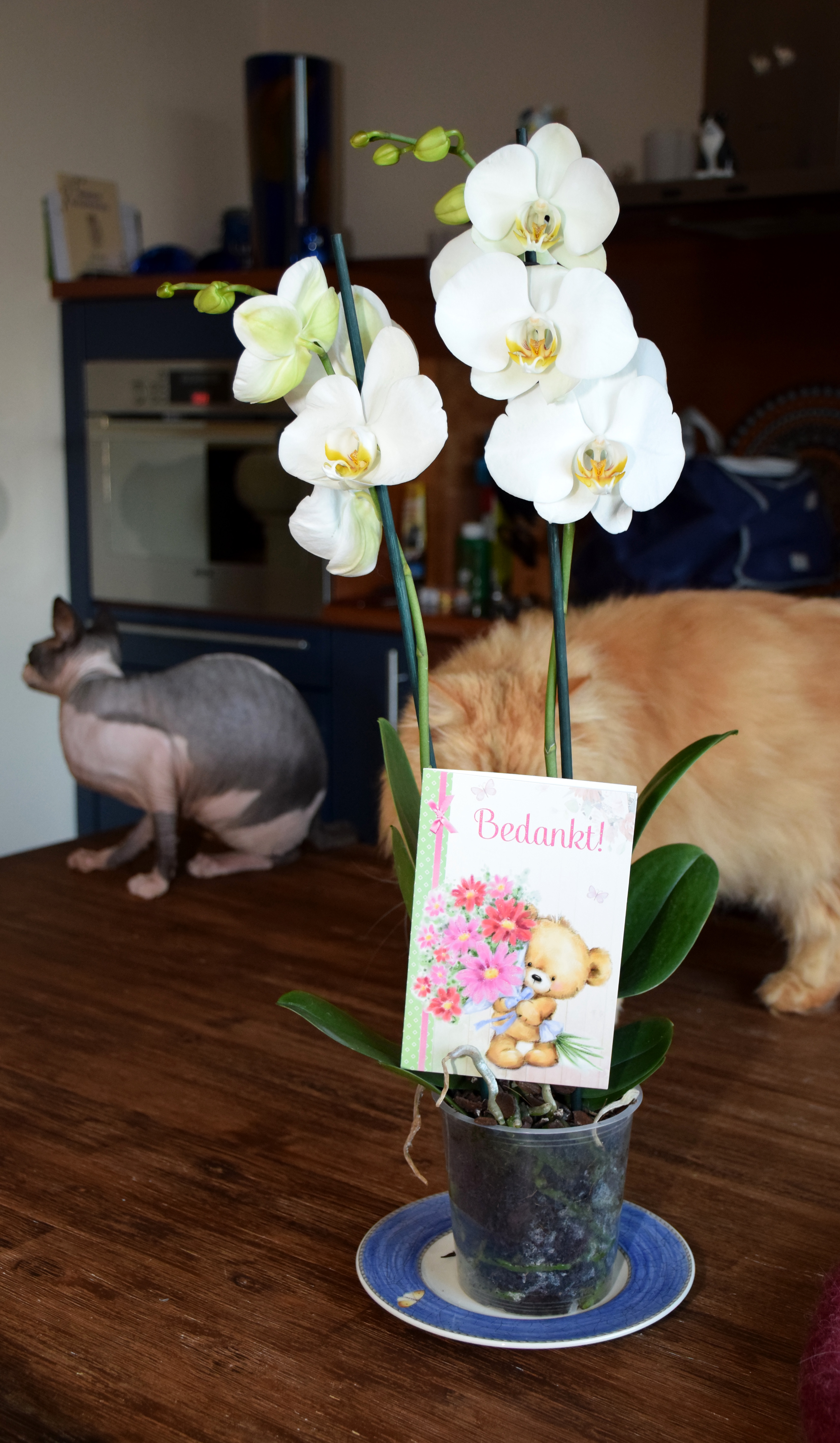 Op woensdag is het de beurt aan Myron Micky en Macey Coco om hun koffertjes te pakken en te vertrekken, naar Schijndel. Lekker dicht in de buurt. Daar aangekomen worden we hartelijk welkom geheten. We brengen de kittens meteen naar boven, naar de kattenbakken en vandaar uit kunnen ze op verkenning. Omdat de indeling van het huis wel een beetje op die van ons lijkt vinden ze al snel hun weg naar beneden en na een grondige inspectie, beginnen ze al snel te rennen en te spelen. Nog een beetje behoedzaam in het begin, maar dat zal al snel over zijn. Omdat we net rond etenstijd daar zijn, krijgen wij ook nog een lekker bord soep aangeboden, gevolgd door een heerlijk ijsje. Ja, ook wij zijn verwend… 🙂 (bedankt nog Inge en Rob). Als we weggaan geeft Inge ons een kleinigheidje, een orchidee, met een leuke kaart erbj. Wat lief…
