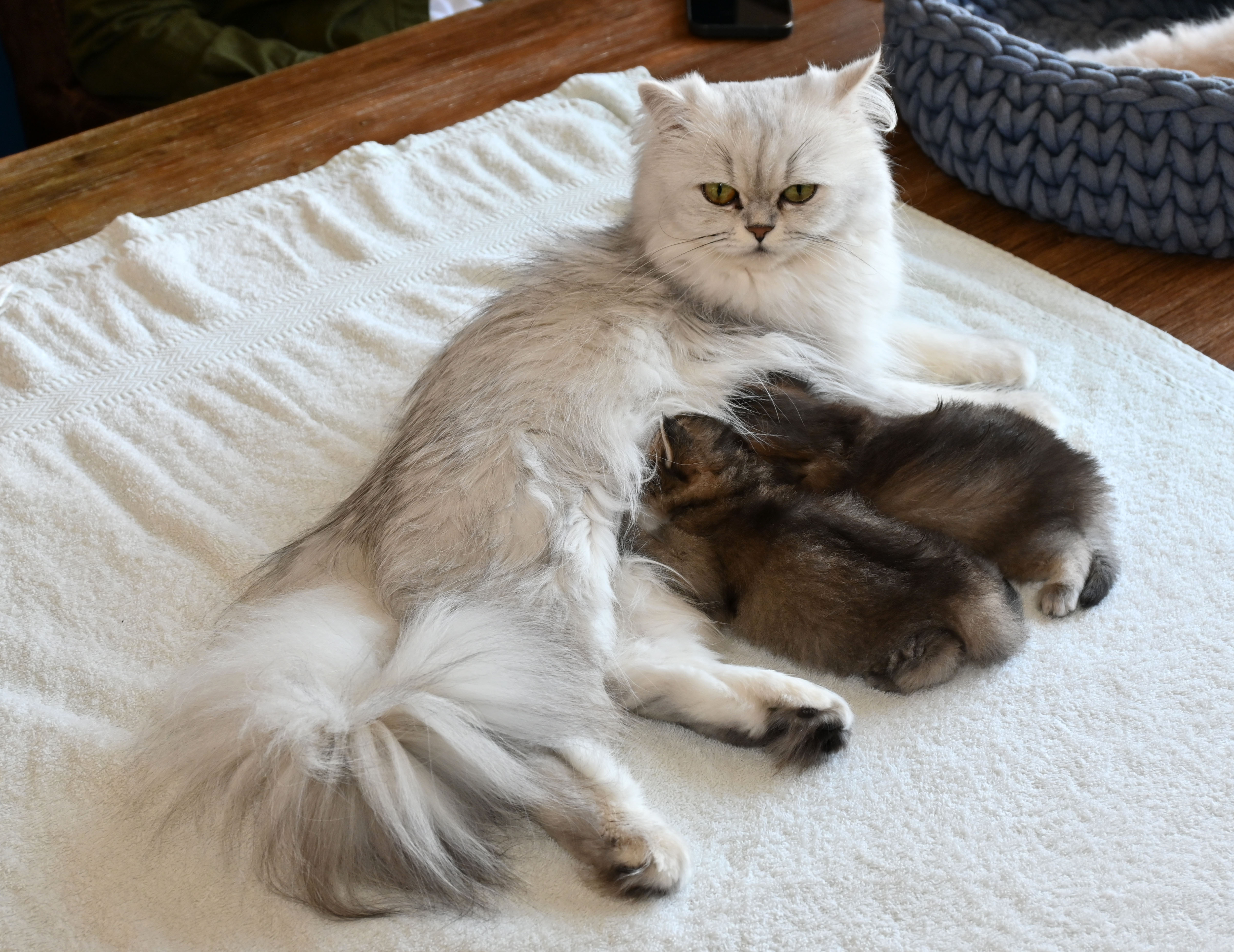 Het nestje was een succes, in de zin van dat ze twee prachtige kittens kreeg. Helaas bleef het uitzwaren achterwege. Ze is en blijft een te tenger poesje om mee te showen, maar dat mag de pret niet drukken.