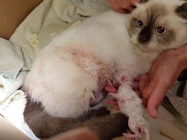 Vandaag was het eindelijk zover. De geboorte van de kittens van Shanna kondigde zich aan. Ze begon om 16.20 uur met weeën en om 17.00 uur zag Rob ineens een vlies met twee pootjes en een staartje uitsteken. Op zich geen reden tot paniek, tenzij je ziet dat je poes onvoldoende persweeën heeft en het kitten niet echt mee lijkt te werken. Ja, dan mag je lichtelijk in paniek raken. Dus meteen de dierenarts gebeld en we konden direct komen. Bram kon met enige moeite het kitten uit het geboortekanaal bevrijden, maar het was eigenlijk al meteen duidelijk dat dit kitten niet meer leefde, al een tijdje dood was zelfs. Van persweeën en een goede ontsluiting was geen sprake, dus was het voor ons allemaal duidelijk: wilden we de andere kittens redden, dan moest het via een keizersnede.