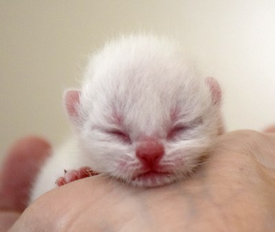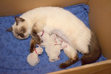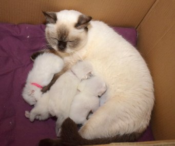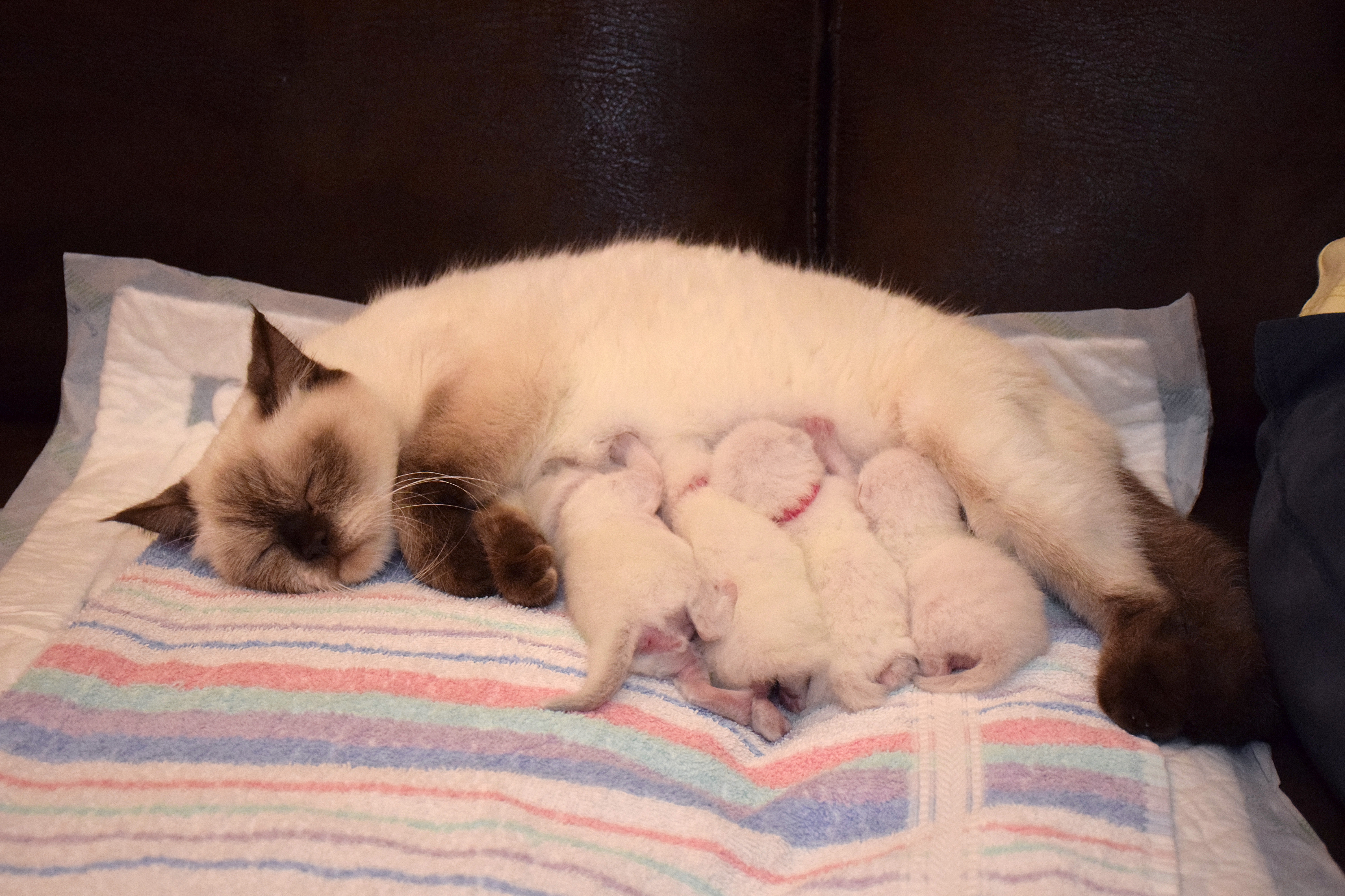 Shanna heeft moeite om in haar moederrol te komen. De eerste nacht is ze nog erg afwezig en beseft ze niet goed dat ze kittens heeft. We kunnen de kittens wel aanleggen, als we haar maar aanmoedigen om te blijven liggen. Wassen doet ze ze niet, dus is het onze eer om regelmatig met een vochtig wattenschijfje de kittens te ontlasten.