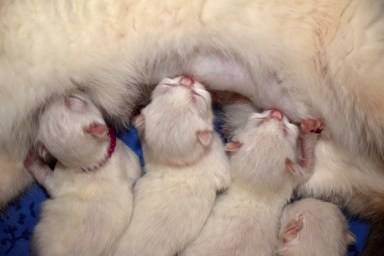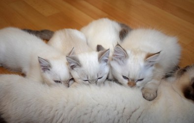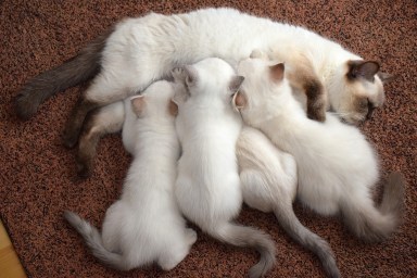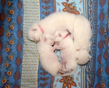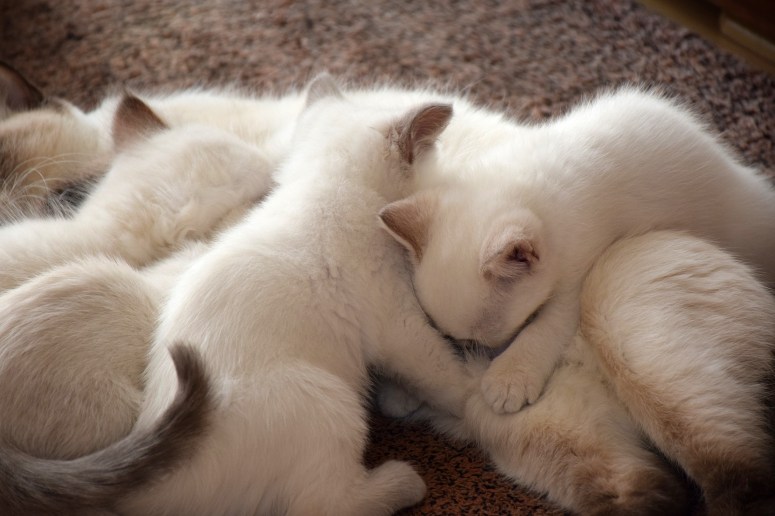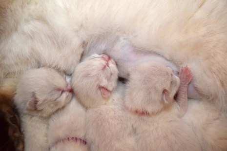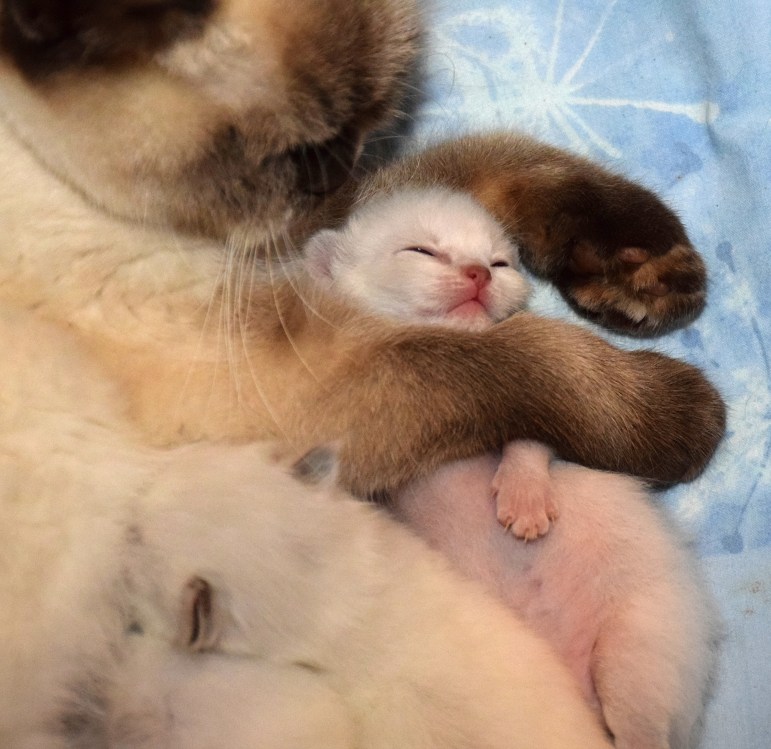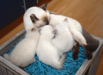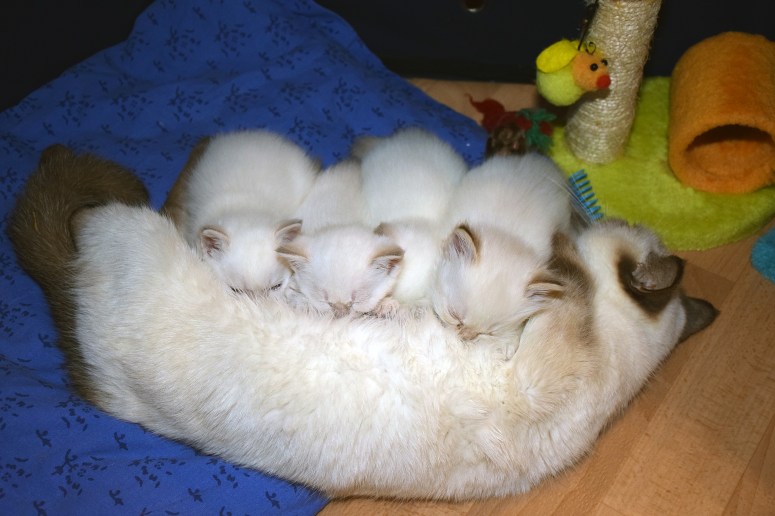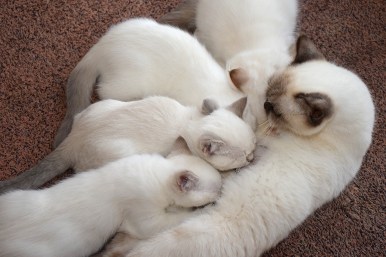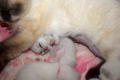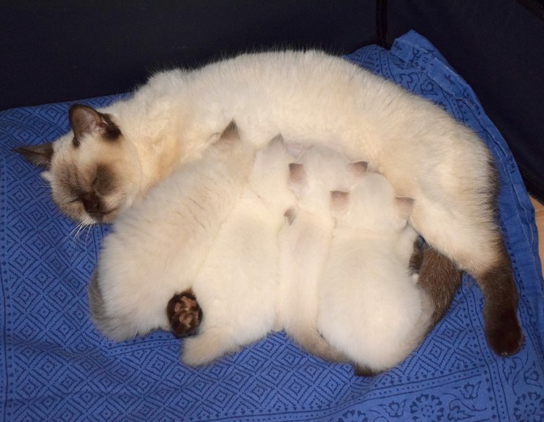 Vannacht hebben we bij toerbeurt gewaakt en de kittens aangelegd en verzorgd. Helemaal vanzelf gaat het allemaal nog niet, de kittens zijn vannacht allemaal aangekomen, dus komt wel goed.