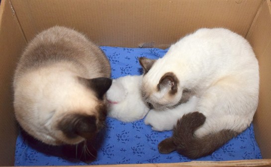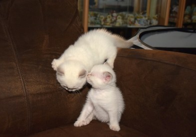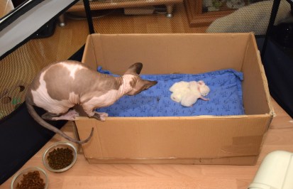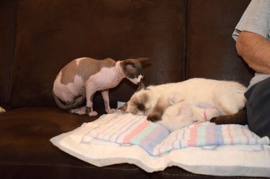 En in de tussentijd vindt Tuth ze steeds interessanter worden. Hij is zo lief voor ze, wil bij ze zijn, ze wassen, met ze spelen, “maar Tuth… ze zijn nog wel heel erg klein om mee te spelen… je moet nog even wachten”, dus dirigeren we hem weer rustig uit de doos. Hij gaat dan maar weer op de kattenbak of op de rand van de stoel zitten gluren naar deze fascinerende kleine wezentjes.
