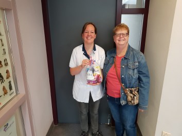 Op vrijdag zijn we nog even terug geweest naar de DAP Sint-Oedenrode, dit keer zonder katten, alhoewel… zoals enkelen van jullie weten is er de afgelopen weken een spontane weddenschap geweest over het aantal kittens dat Shanna droeg. Saskia had er drie op de echo gezien, maar ze waren inmiddels te groot om te zien of het er meer waren. In de weddenschap werd door Saskia zes stuks geraden en dit bleek het juiste aantal te zijn, dus had ze gewonnen. Winnen verdient natuurlijk een prijsje, dus heb ik een leuk pakketje met snoepjes, een Cattery Cherished pen, speeltjes en een gehaakt katje verpakt en zijn we dit vrijdag aan Saskia gaan uitreiken. Vooral het gehaakte katje valt erg in de smaak, ook bij haar katten, zoals ze ons later laat zien.