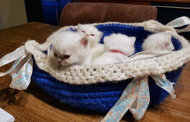 De weegmomenten zijn een feestje. De doos komt op tafel, het gehaakte mandje komt bij mij te liggen. Rob weegt… ze om beurten en legt ze in het mandje, zodat ik lekker even met ze kan kroelen, terwijl hij het dekje in de doos verschoont. Dit alles moet niet al te lang duren, anders komt mama ons vertellen dat het genoeg is geweest. In sommige gevallen gaat ze gewoon gezellig mee in het mandje liggen.