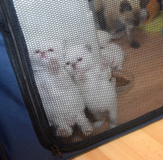 Afgelopen donderdag: tweede entingdag. Omdat Blue Tess en Banjer ook aan hun jaarlijkse enting toe zijn, vertrekken we met drie reismanden richting dierenarts. Eerst is Banjer aan de beurt, die met zijn 13 jaar weer APK goedgekeurd wordt en nu een chip krijgt, zodat hij uit de voederautomaten kan eten. Dan is Blue Tess, de overgrootmoeder van de kleintjes, aan de beurt. Ook zij wordt met haar 12 jaar APK goedgekeurd en krijgt een chip. En dan zijn de kleintjes aan de beurt. Als ik de reismand met de vier bolletjes op tafel zet, is het meteen oh en ah. Maar stoer zijn ze niet, ze blijven lekker bij elkaar, veilig in de mand. Maar dan wordt Shah toch wat nieuwsgierig en gaat op de rand staan, dus hij is de eerste. Hij wordt helemaal nagekeken en krijgt zijn laatste prik. Geen probleem. Intussen kruipt Blue Tess bij de kleintjes in de reismand, want ze hebben toch zorg en begeleiding nodig, terwijl Banjer zich onder de verwarming verschanst. Bij onze dierenarts mogen de beestjes namelijk gewoon even los rondlopen, altijd gezellig om te zien hoe ze reageren.