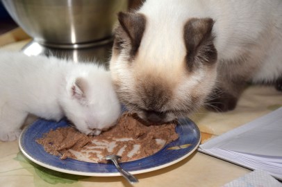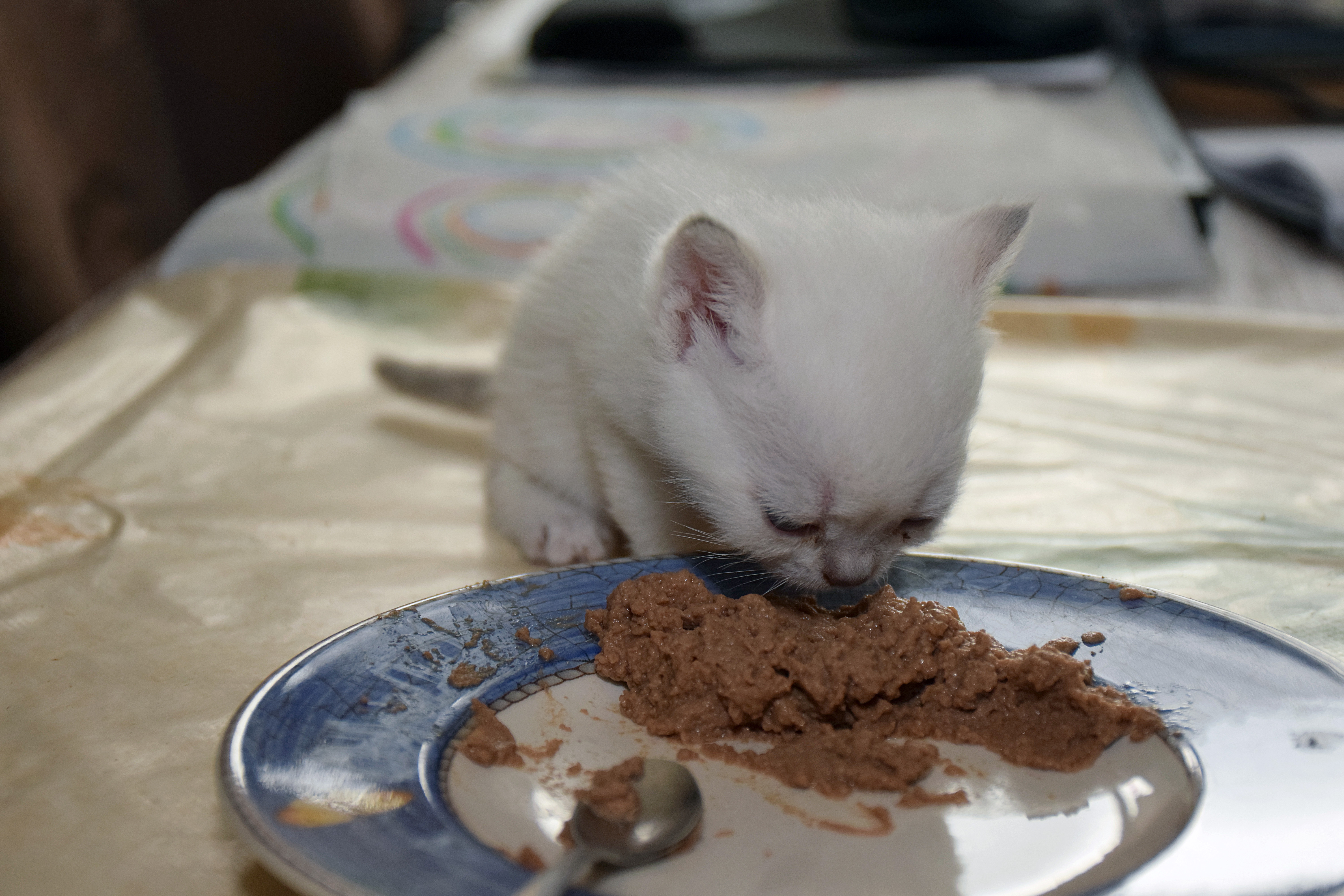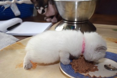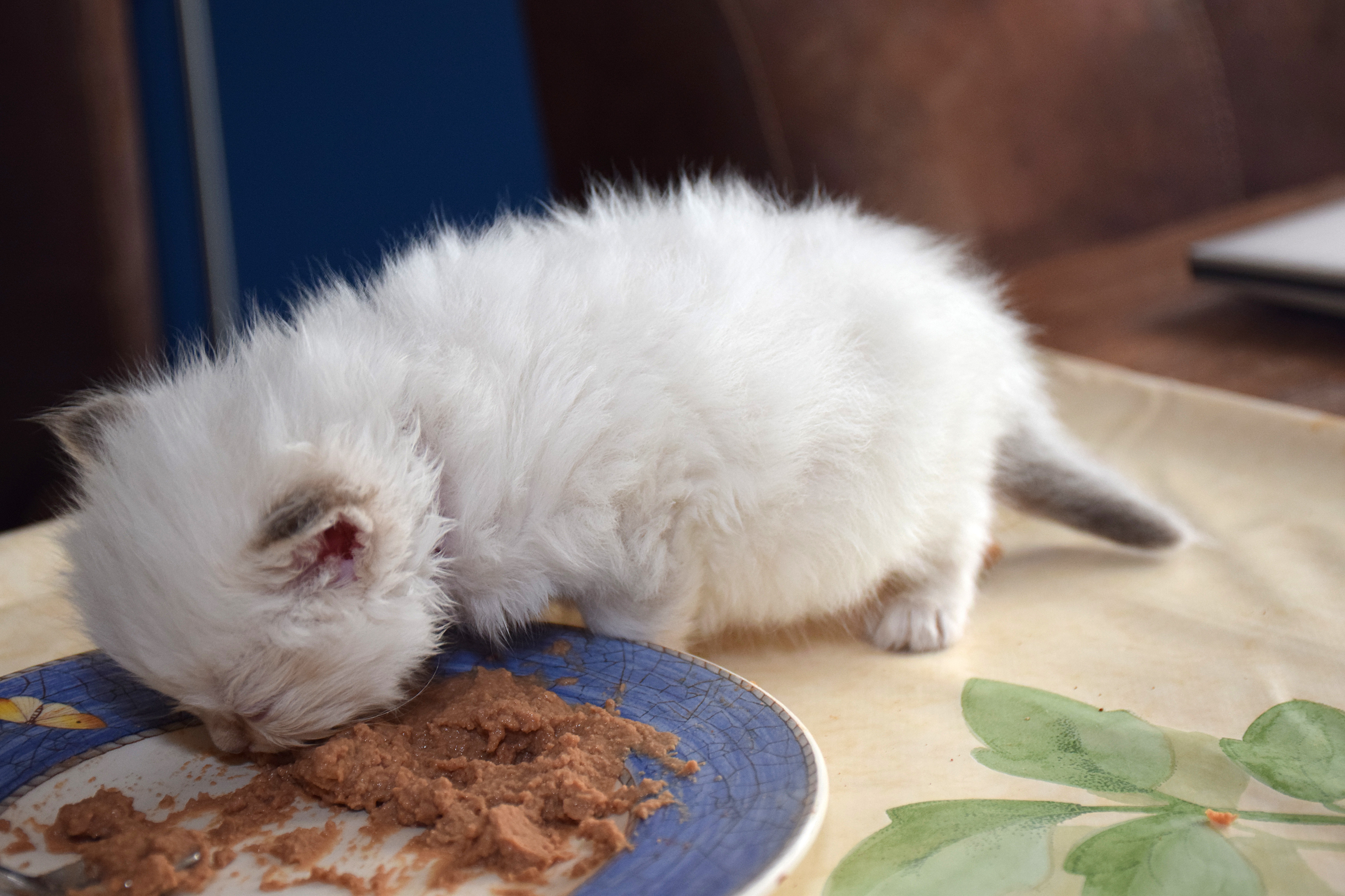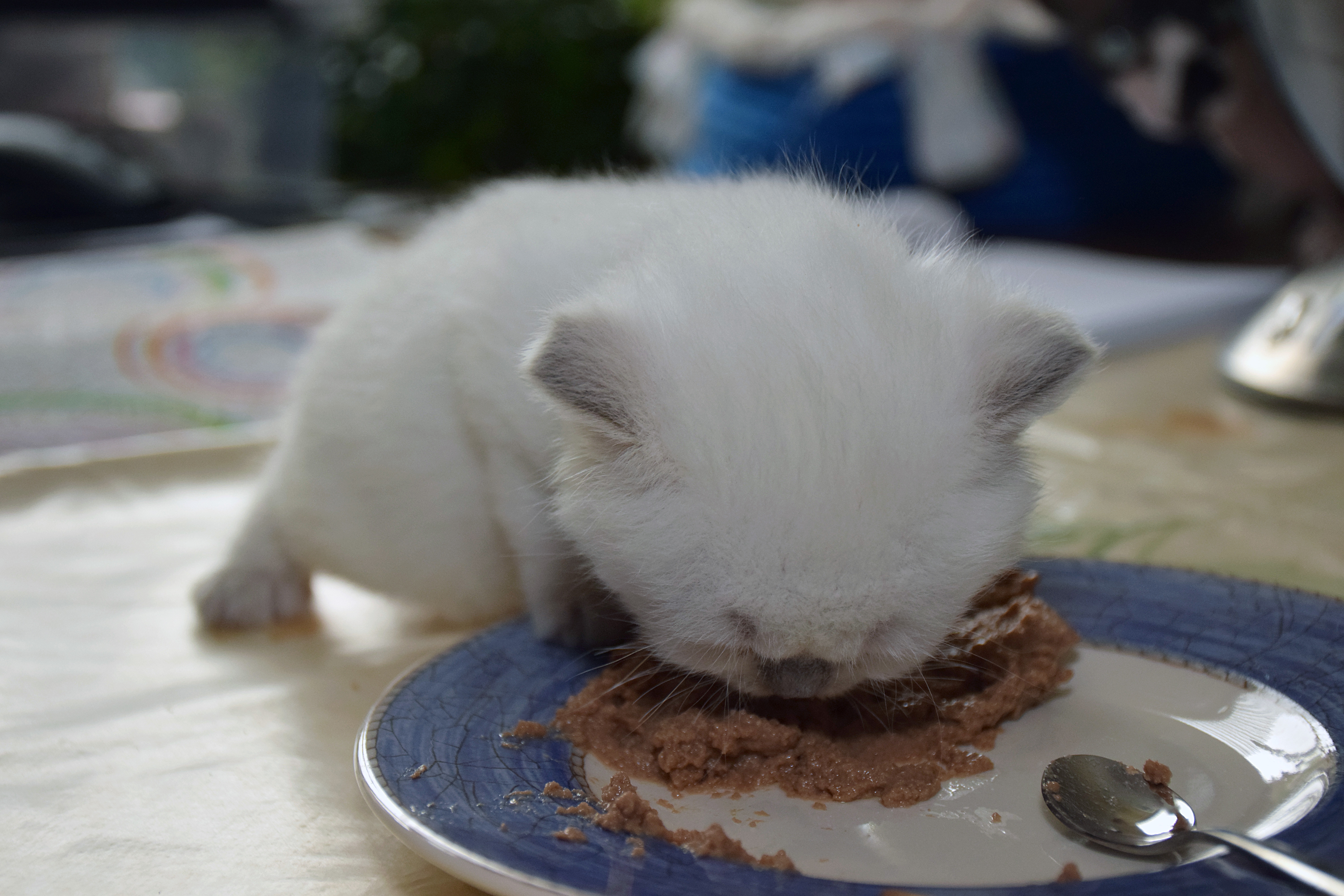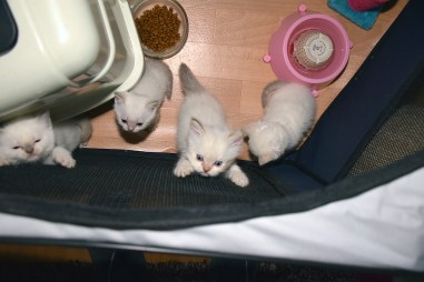 Ze krijgen op zondag voor het eerst vast voer. Ze zijn er echt aan toe. Leia begint meteen uit mijn hand te eten, af en toe “auw” een vingertopje meenemend. Whiskers en Tiago snappen het nog niet zo goed en zijn nog niet gecharmeerd van het smaakje, maar alles wat voor hun bestemd is, gaat er toch goed in. Shah, hahaha… die heeft weinig overtuiging nodig, die hapt er, net als zijn zusje, gretig op los. En ja, vast voer betekent ook dat de ren verbouwd moet worden en het kittenkattenbakje de ren in moet. Kleine kittens worden groter.