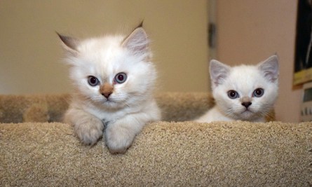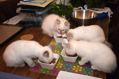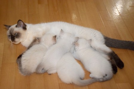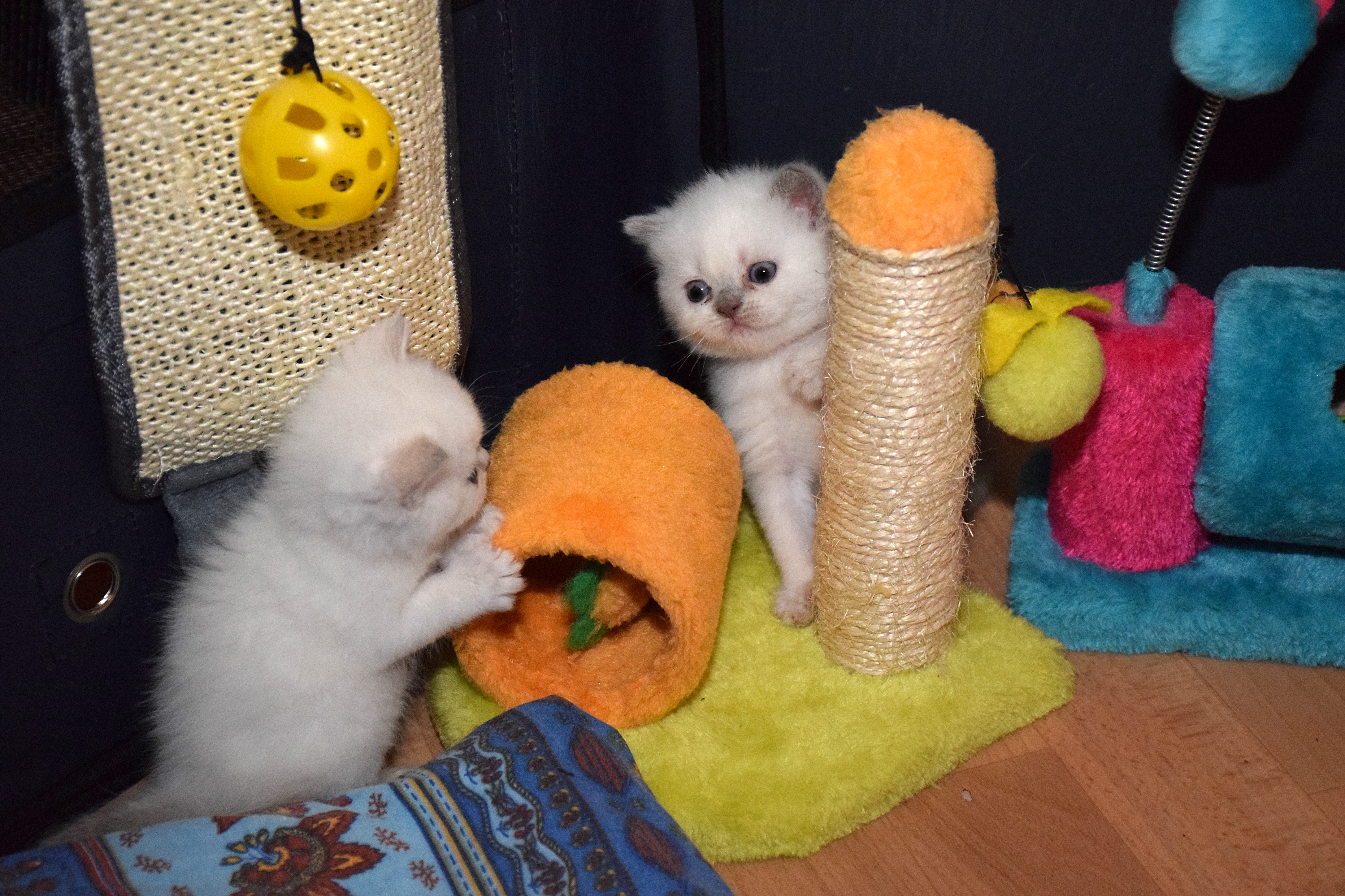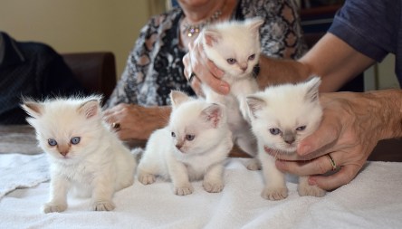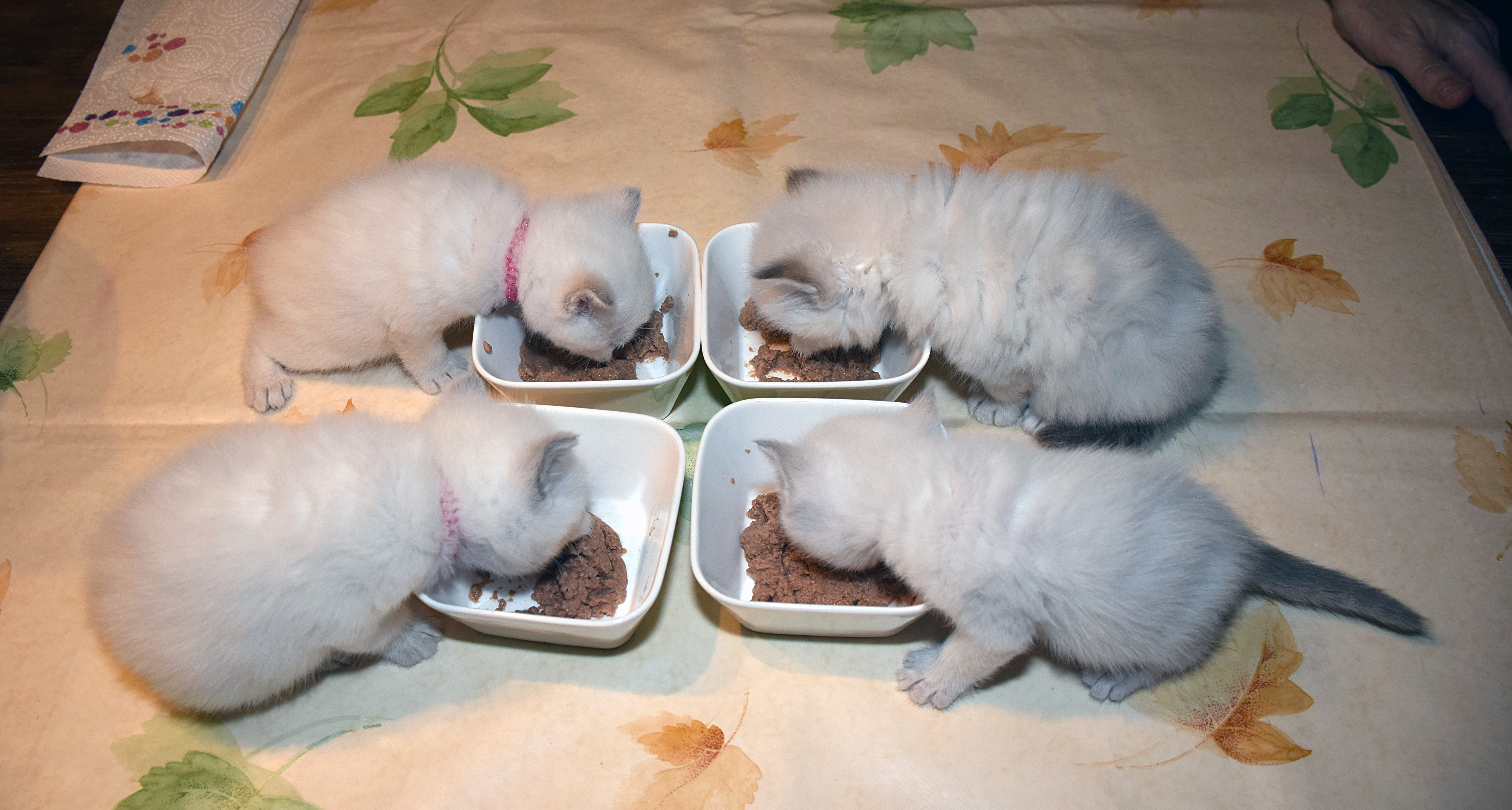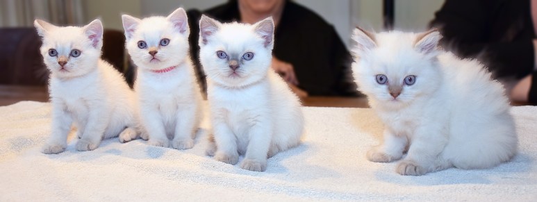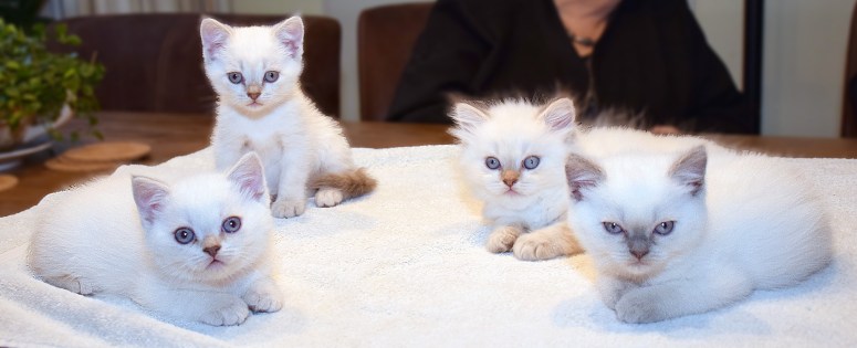 De kleuren zijn inmiddels ook bekend: Leia, Whiskers en Tiago zijn lilac point en Shah is chocolate point. Shah is daarbij ook nog eens een Brits Langhaar!