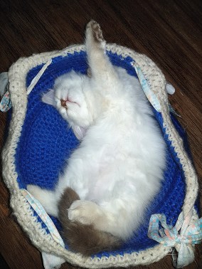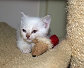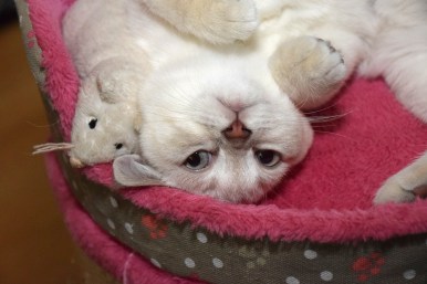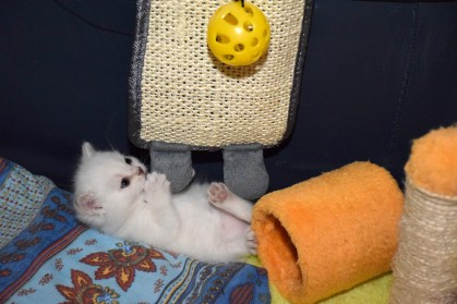 Shah vond het niet direct nodig om zichzelf “te verkopen”. Hij lag liever te pitten en maakte zich niet druk of “zijn missie” geslaagd was. Pas nadat hij zijn slaapje uit had, wilde hij nog wel even spelen en zijn charmes in de strijd gooien, vooral lief en dromerig je potentiële nieuwe personeel aankijken en af en toe heel lief en schattig tegen ze miauwen. Oh ja, toch ook nog maar even gewillig een foto laten maken…. om vervolgens weer bij zijn broertjes en zusjes in slaap te sukkelen. En missie geslaagd, want een dag later horen we dat ook Shah zijn gouden mandje heeft gevonden bij Robin en Coen.