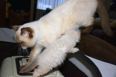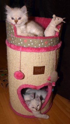 Je houdt ze nu echt niet meer in de ren, tenzij ze slapen natuurlijk of als je het deurtje en de bovenkant dichtritst. Is de bovenkant open, dan rennen ze binnen en mum van tijd door de huiskamer. En dat is zo prachtig! Vier bolletjes wol, staartjes de lucht in, met alles spelen wat ze tegenkomen. Spookgevechtjes met hun eigen schaduw of met een denkbeeldig vijandje of gewoon met elkaar. Soms kan het er ook fel aan toe gaan. Dan rollenbollen ze over elkaar en bijten elkaar speels waar het kan, daarbij hun eigen krachten niet altijd kennende, dus gaat er weer een “skreew” door de kamer. Tuth vindt het geweldig! Zelf is hij tenslotte ook nog maar net een half jaar, dus dit speelse gedrag zet hem aan tot een wat ruwer spel dan de kleintjes al aankunnen. Soms moeten we hem dus toch een beetje corrigeren als hij iets te enthousiast is. Maar… vinden ze het erg? Niet echt, want ze zoeken hem iedere keer weer op voor een volgend robbertje stoeien.