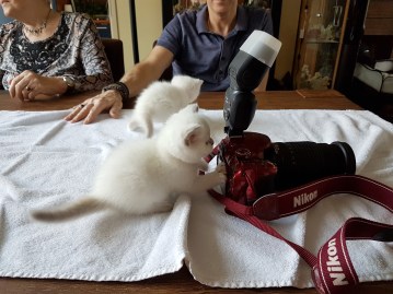 Het blijft geweldig, bezoek krijgen, alle kittens op tafel en laat ze maar ravotten. Je krijgt er geen genoeg van en de lachsalvo’s klinken dan ook door de kamer. Dit keer waren mijn nichten Loes en Henny op bezoek. Wat hebben we met zijn allen genoten van de bengeltjes. Ook mama komt dan af en toe langs, pruttelend: “kinderen, kom eens hier, ik heb wat lekkers voor jullie”, en niet lang erna ligt ze met vier smakkend, spinnende kleintjes, genoegzaam zelf ook te spinnen.