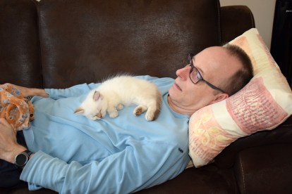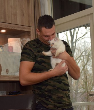 De kinderen waren goed geïnformeerd dat ze niet meteen op Whiskers af moesten komen. Hij ging meteen de kamer ontdekken, lekker vrij rondlopend. Imani, de jongste, begon met een hengeltje met hem te spelen terwijl papa Igor het op de grond lag te filmen. Ziva, de oudste, zat op een afstandje te genieten en ging later ook meespelen. Een dag later kregen we al een berichtje dat alles goed was verlopen en dat hij al bij het hele gezin op schoot komt liggen. Mooier kan toch niet?