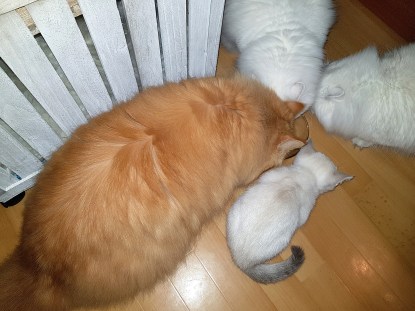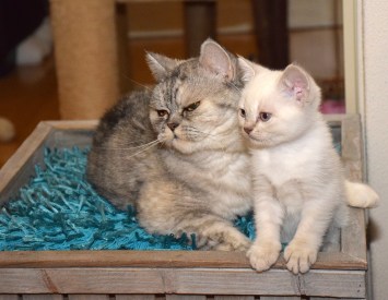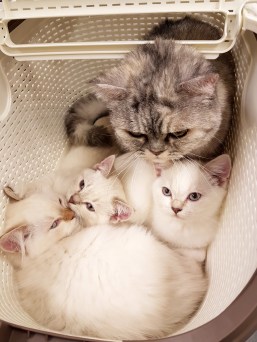 De reactie van onze andere katten is wisselend. Tuth is heel gefacineerd door de kleintjes. Heel voorzichtig snuffelt hij aan ze, als het mag, of zit hij op een afstandje te kijken. Woensdag gaat hij zelfs de ren in, eerst over de rand van de doos kijken, dan zijn voorpoten op de doos, vervolgens zijn achterpoten ook op de rand van de doos en heel voorzichtig met zijn voorpootjes in de doos en aan de kittens snuffelen. Shanna is op dat moment even “niet thuis”. Als ze terug komt, snuffelt ze aan Tuth, gaat de doos in en op het moment dat ze weer bij haar kittens wil gaan liggen, geeft ze een klein grommetje richting Tuth, zo van “het kraambezoek is nu voorbij”… en Tuth gaat netjes weg. Uiteraard houden we goed in de gaten wat er gebeurt. Blue Tess, tja, niets aan toe te voegen, die is zorgovergrootoma en krijgt niet genoeg van het kleine grut en als ze toch bezig is met zorgen, poetst ze Shanna ook meteen op. Laleh komt af en toe bij haar kleinkindjes kijken, maar is meer met haar eigen “kindjes” (speeltjes) in de weer. Aislinn vindt het heel spannend en komt af en toe ook loeren, maar op afstand. Banjer negeert ze, die houdt niet van kleine kittens, maar als ze straks gaan rondlopen, gaat hij er wel mee spelen. Galen vindt ze een beetje eng, maar gaat toch af en toe op afstand kijken. Ushi en Mili worden niet overspoeld door moedergevoelens bij het horen van de kleine piepjes en gaan hun eigen gangetje. Naar Shanna toe reageert iedereen, behalve zorgovergrootoma Blue Tess, normaal. Vandaag heeft Shanna Whiskers opnieuw twee keer “ontvoerd”, de eerste keer strandt hij voor de krabpaal, maar de tweede keer lukt het wel en ligt ze mooi met hem te tutten in het huisje van de krabpaal (1,5 meter hoog!). Leia en Shah hebben vanavond hun geboortegewicht al verdubbeld, Tiago en Whiskers gaan dat morgen ook ruim doen. Mooi op schema dus! Op naar week twee, volgende week meer…. ![]()