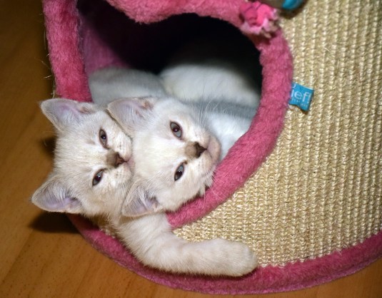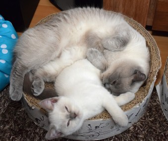 Op zondag besluiten we dat het tijd is dat ze echt mogen rennen, dus doen we de ren open… zoefzoef.. en weg zijn ze, het lijken wel kleine Max Verstappentjes.. Tuth weet niet waar hij het heeft, wil met ze spelen, maar lieve Tuth, dan moet je niet zo ruw doen hoor, het zijn geen muizen! De kleintjes hebben het snel in de gaten als Tuth ze wil pakken en schieten gauw onder de salontafel of onder mijn stoel. Ze vinden het prachtig. De andere katten moeten wel even wennen aan die snelheidsduiveltjes en gaan er regelmatig voor op de vlucht of liggen op een afstandje te loeren. Na zo’n 20 minuten vinden we het mooi geweest en zetten ze terug in de ren, deurtje weer dicht… wat denk je? Vliegen ze allemaal richting uitgang met hun neus in het gaas… en nog een keer proberen en nog een keer om dan te beseffen, verdomd die deur zit echt dicht. Dan maar via de kattenbak! Maar ze zijn toch wel moe, dus een aantal gaat lekker op hun kussen liggen slapen, maar Whiskers niet. Hij vindt het veel leuker om bij mij op schoot te kruipen en daar heerlijk eerst nog wat te spelen om vervolgens in slaap te sukkelen. Heerlijk zo’n geboren schootkatje, daar smelt je hart toch van. En dit doet hij niet één keer, maar regelmatig. Als Whiskers weer eens op schoot ligt, klimt Leia ook uit de ren en gaat heerlijk bij hem liggen. Ze spelen wat en vallen dat samen in slaap… Hoe gelukkig kun je je op zo’n moment voelen, dit is toch zalig.