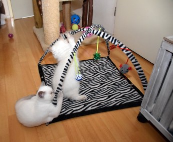 Het gaat vanaf de eerste nacht goed. Geen kik gehoord. ’s Morgens mogen ze zo snel mogelijk de bench uit, om verder te spelen in de kattenkamer en de rest van het huis.