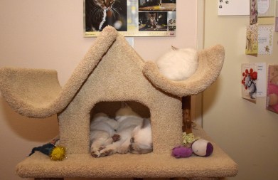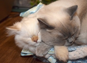 En wat zijn ze aanhankelijk! Met name Whiskers. Iedere avond als ik eenmaal in mijn stoel zit en het deurtje van de ren dicht is, omdat ze soms toch ook even moeten rusten, klimt hij via de kattenbak uit de ren en gaat heerlijk bij me op schoot liggen slapen. Daar word je zo blij van! Maar ook de anderen houden van kroelen. Als Rob op zijn knieen op de grond gaat liggen, komen ze uit alle hoeken naar hem toe om hem een knuffel te geven… zo vertederend.