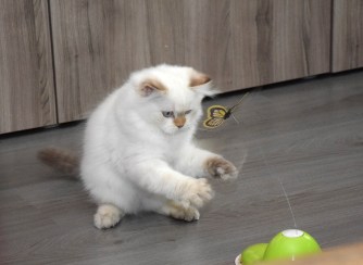 Hadden ze een kleine groeiachterstand? Nou, die is inmiddels door drie van vier ingelopen. Je ziet ze gewoon groeien. Whiskers lijkt het kleinst, maar intussen is hij aardig op weg om zijn grote broer en zus in te halen. Tiago is nog niet helemaal op streefgewicht. Hij is zo kieskeurig met eten. Nee, babycat daar is hij op uitgekeken. Okee, proberen we even gourmet, voor de smaak. Ja, hij lust het, maar na een paar dagen, haalt hij er zijn neus voor op. Schesir is de volgende poging en jawel, hij vindt het heerlijk. Het is iedere dag weer een avontuur waar hij voor gaat. In de ren staan verschillende soorten en smaken kittenbrokjes. Onze verbazing is groot als hij na een dagje showen van ons goed is aangekomen. Hmmmm…. houdt hij ons nu voor de gek? Verwennen we hem teveel? Moeten we hem misschien wat minder pamperen, zodat hij vanzelf meer aan de brokjes gaat? Och, zolang hij aankomt, is er niets aan de hand, ook al is het een beetje minder dan zijn broers en zus.