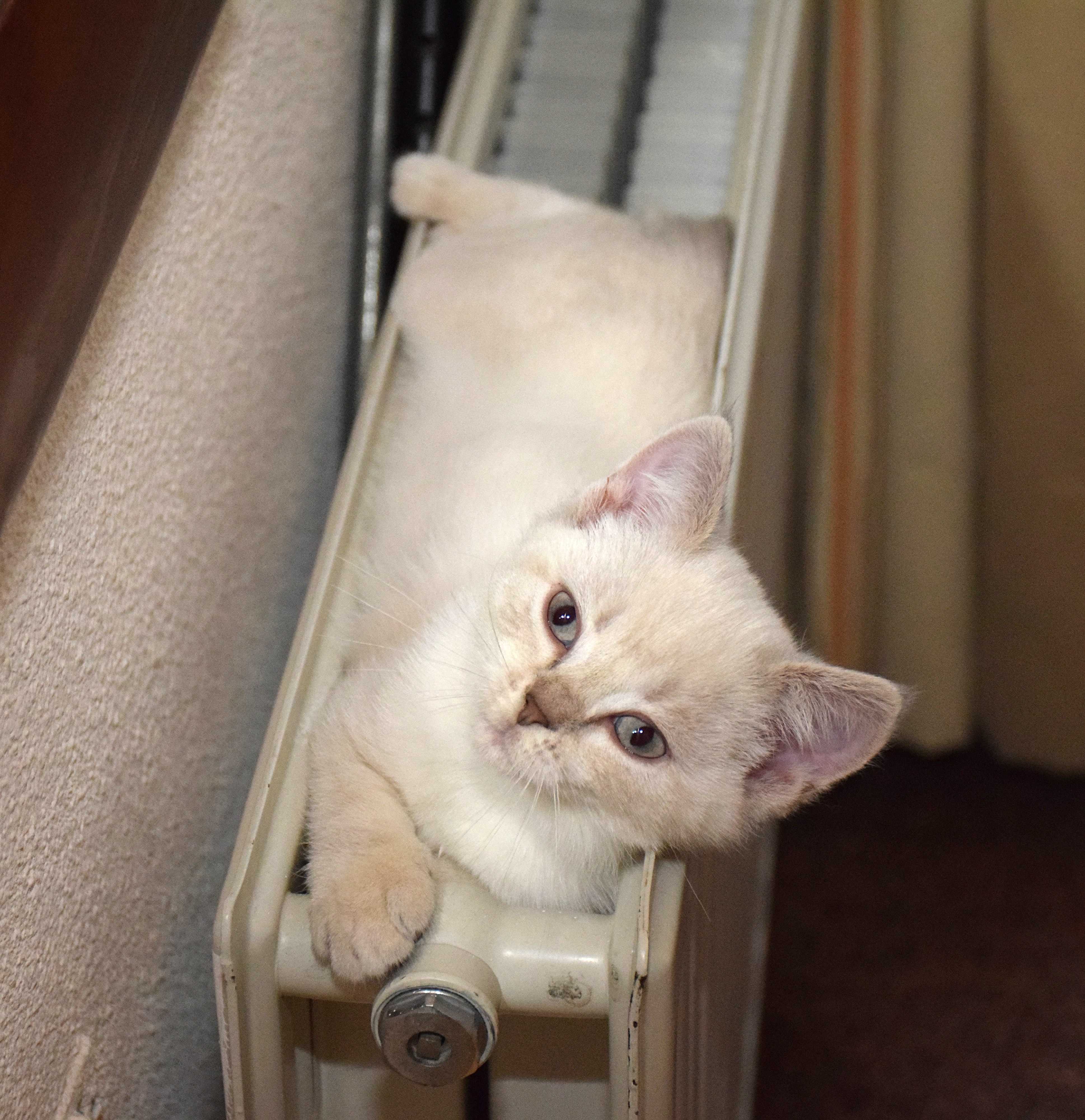 WK10-2017-11-13, 022_Whiskers Whiskers op zijn nieuwe verstopplek: de verwarming in de gang. Foto’s en teksten: eigendom en copyright Cattery Cherished.