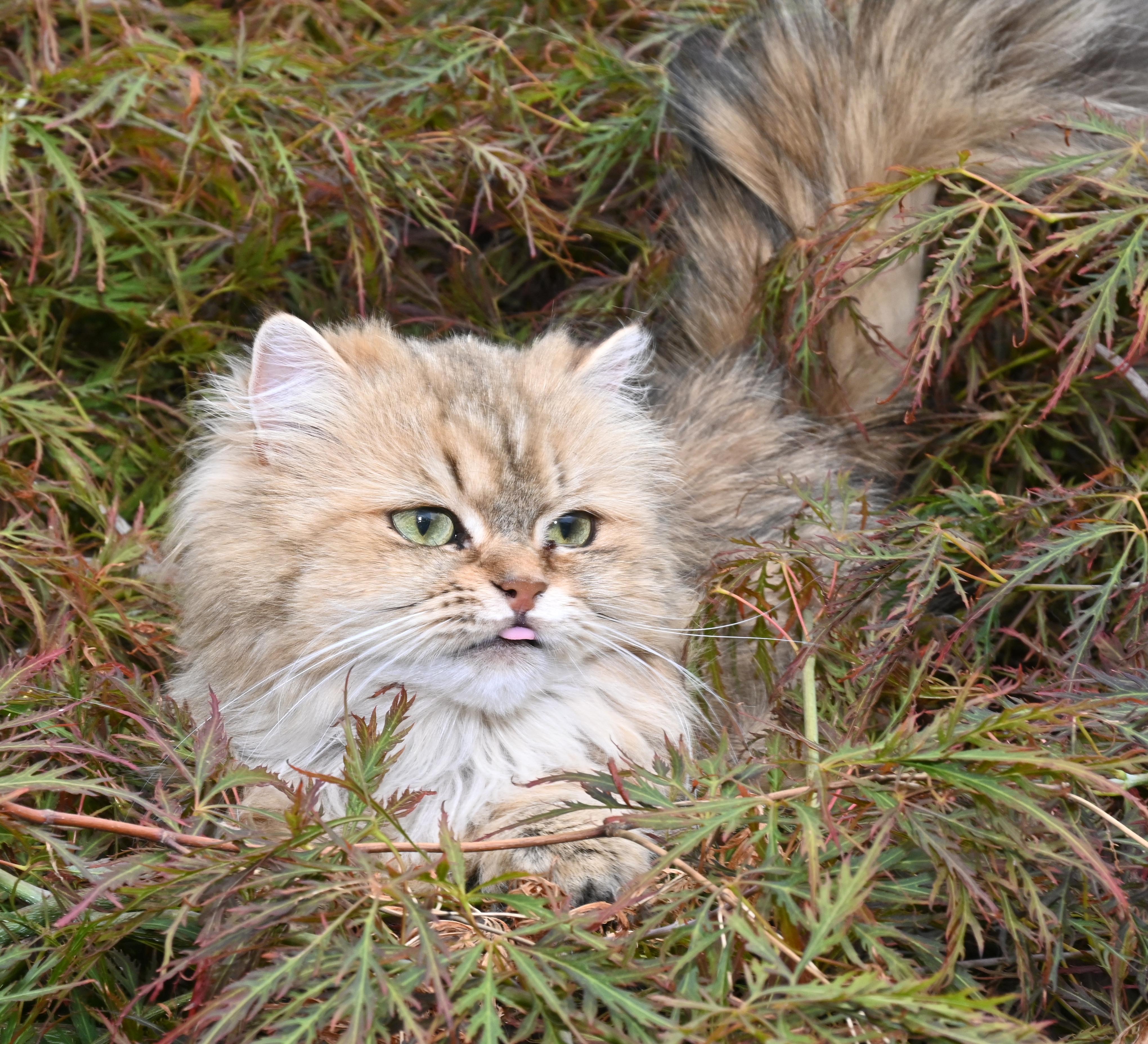 Haar karakter is geweldig. We noemen haar regelmatig Piep, omdat ze niet miauwt maar piept, dus al snel kreeg ze die bijnaam. Als je haar wilt kammen, begint ze pruttelend te protesteren. Niet dat ze kammen heel erg vindt, maar ze vindt toch dat ze er niet zonder slag op stoot aan mag toegeven. Het pruttelen is een lief gepruttel, niets kwaadaardigs of boos… :-). Klein eigenwijsje.