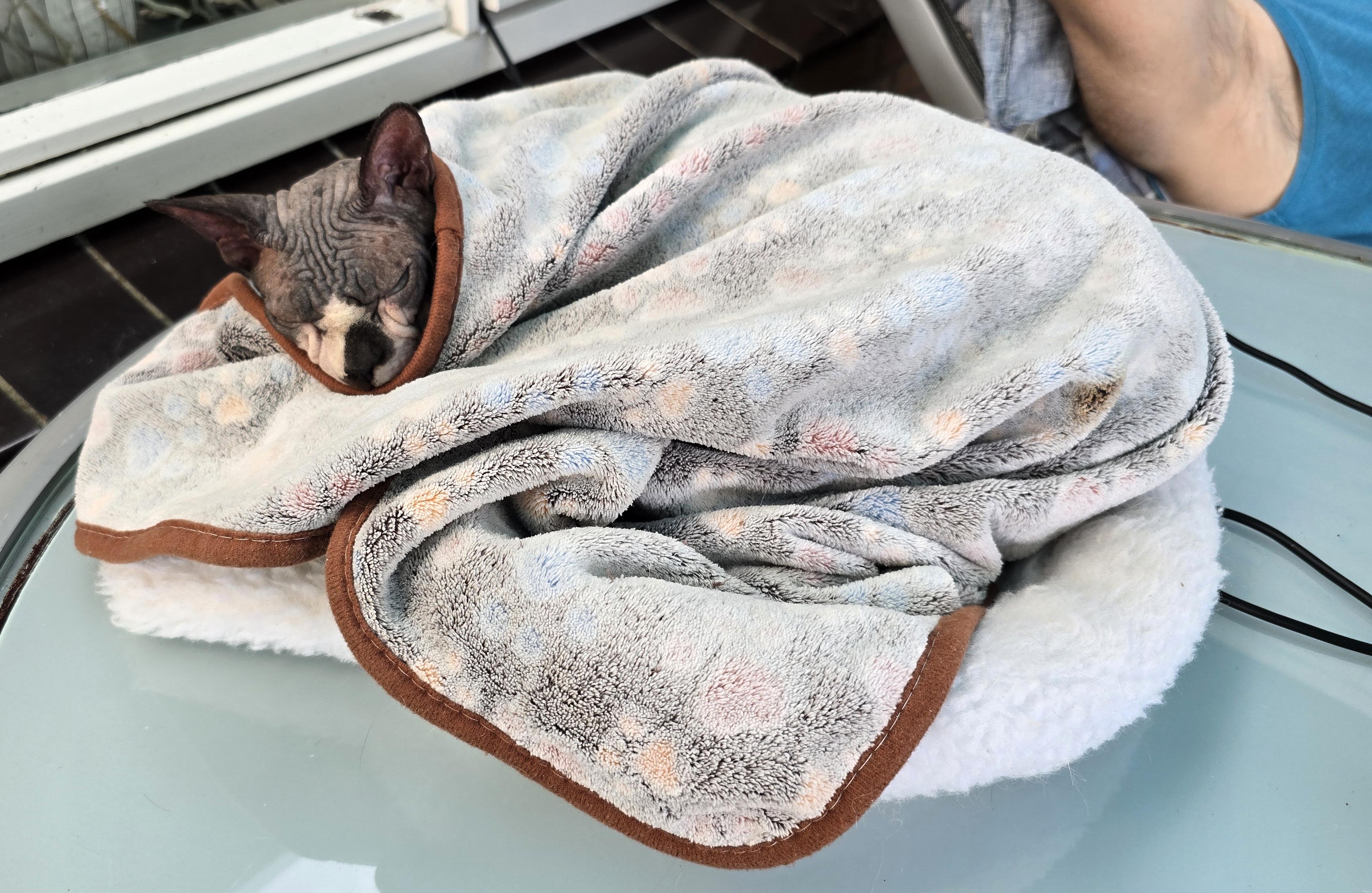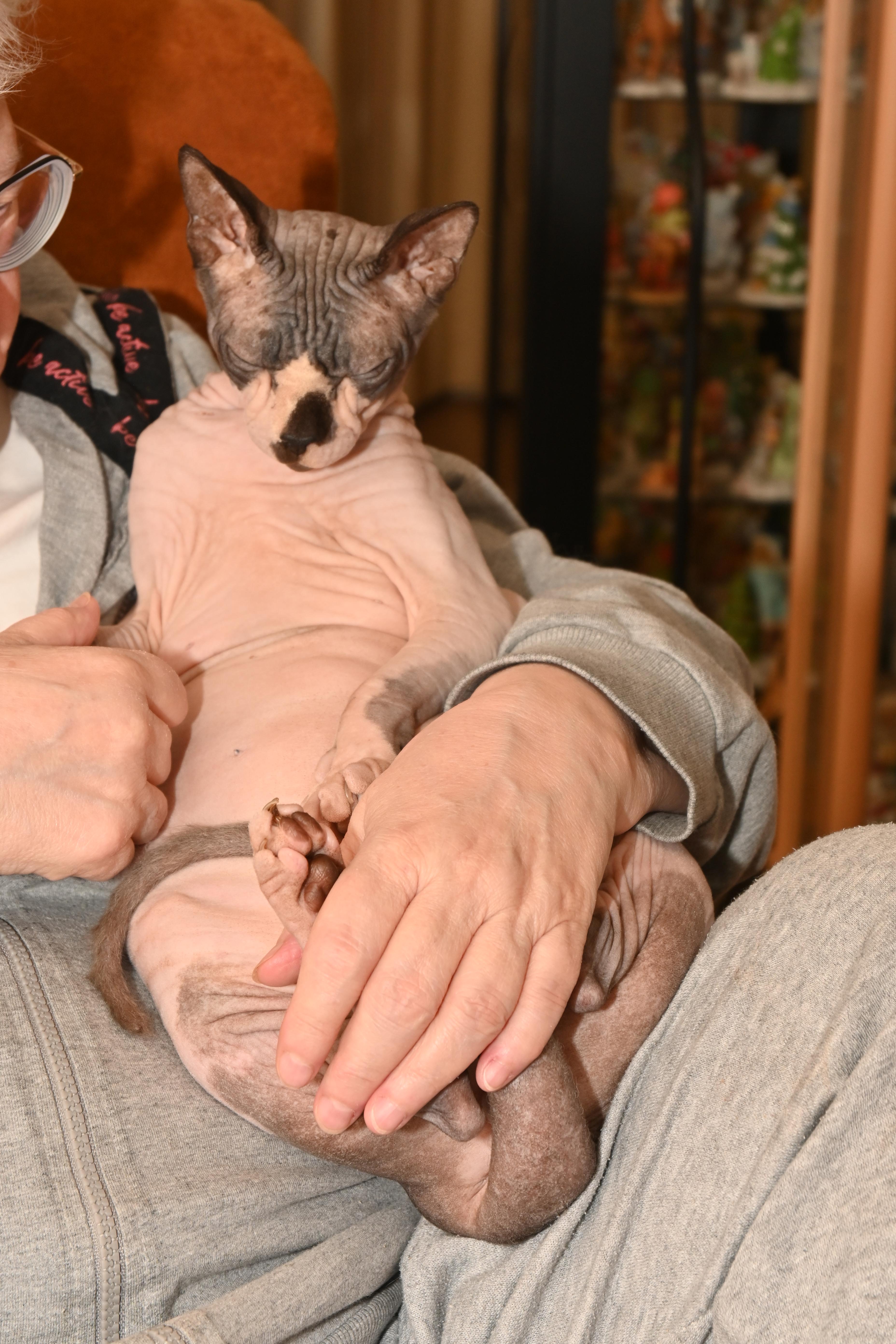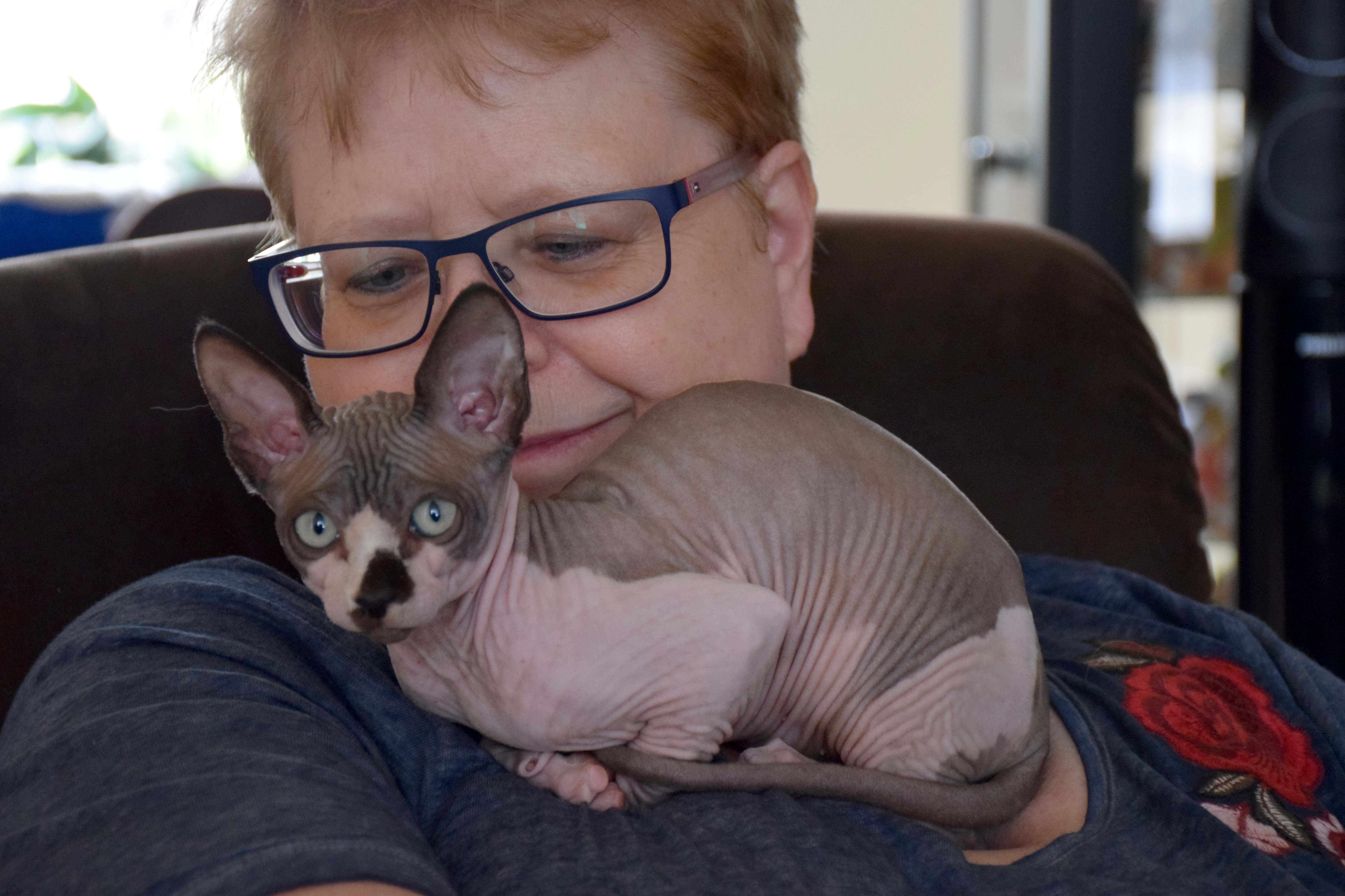 Toen we een maand later weer naar een show gingen, stond Herma Geurtz dichter bij ons en iedere keer als zij naar de keuringsruimte ging, moest ze langs ons. Mijn nieuwsgierigheid was gewekt, dus vroeg ik haar of ik eens mocht voelen hoe zo’n kaal huidje nu aanvoelt. Welwillend als Herma is om de Sphynx bij anderen te introduceren, stemde ze meteen toe. Ik verwachtte een kil stroef huidje te gaan voelen, dus was ik aangenaam verrast dat het huidje heerlijk warm en perzikachtig aanvoelde. Wat een unieke ervaring!
