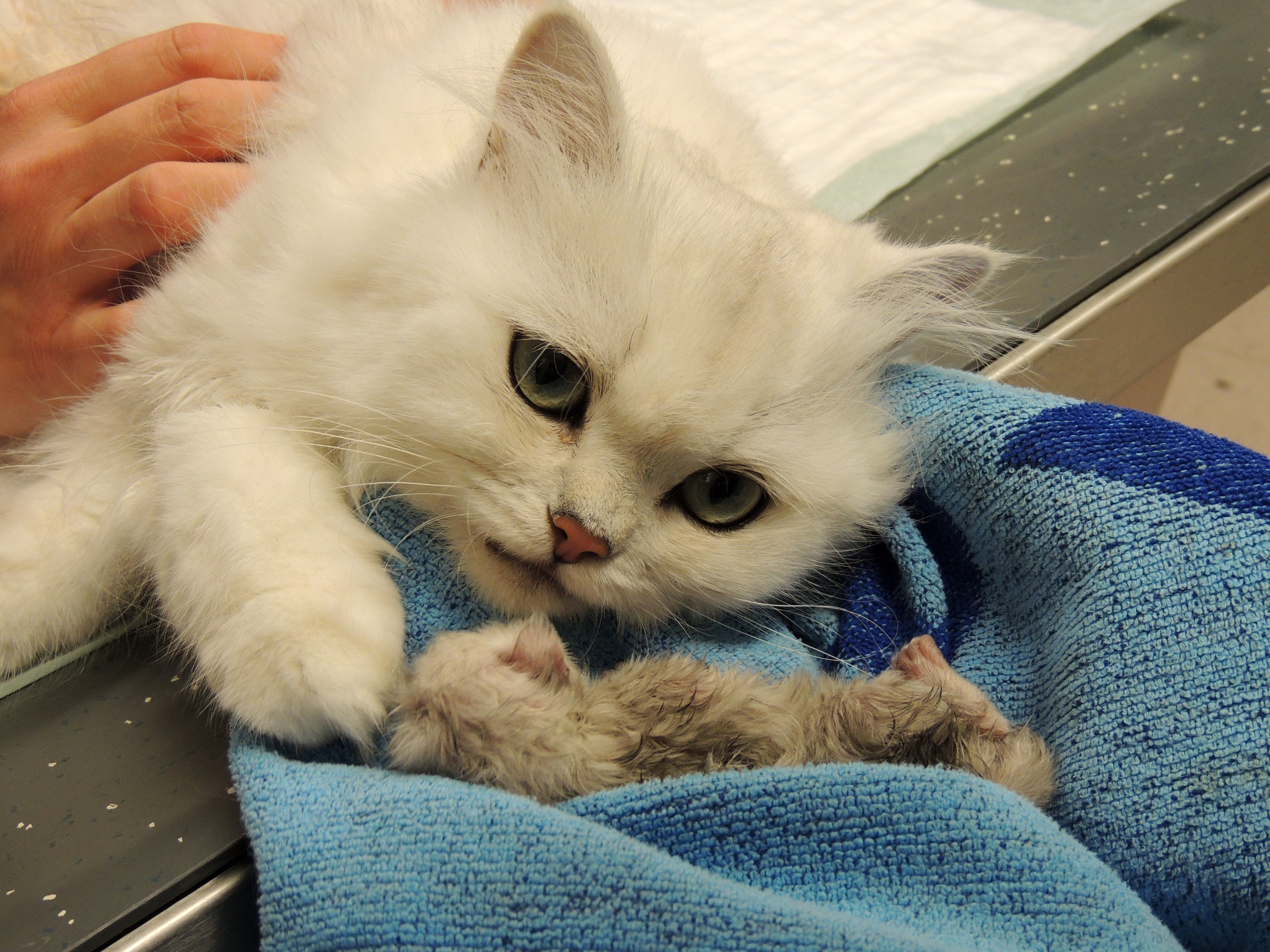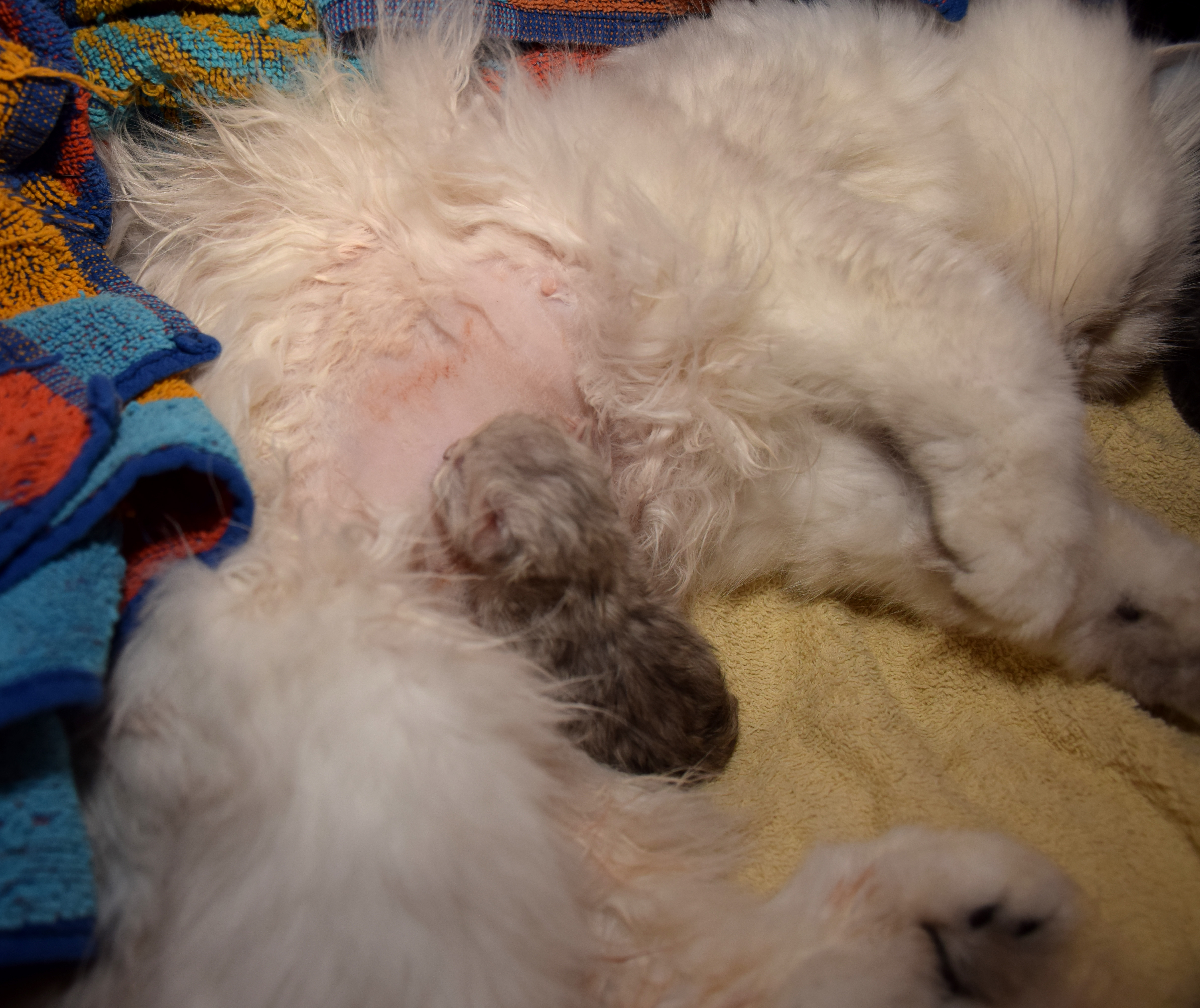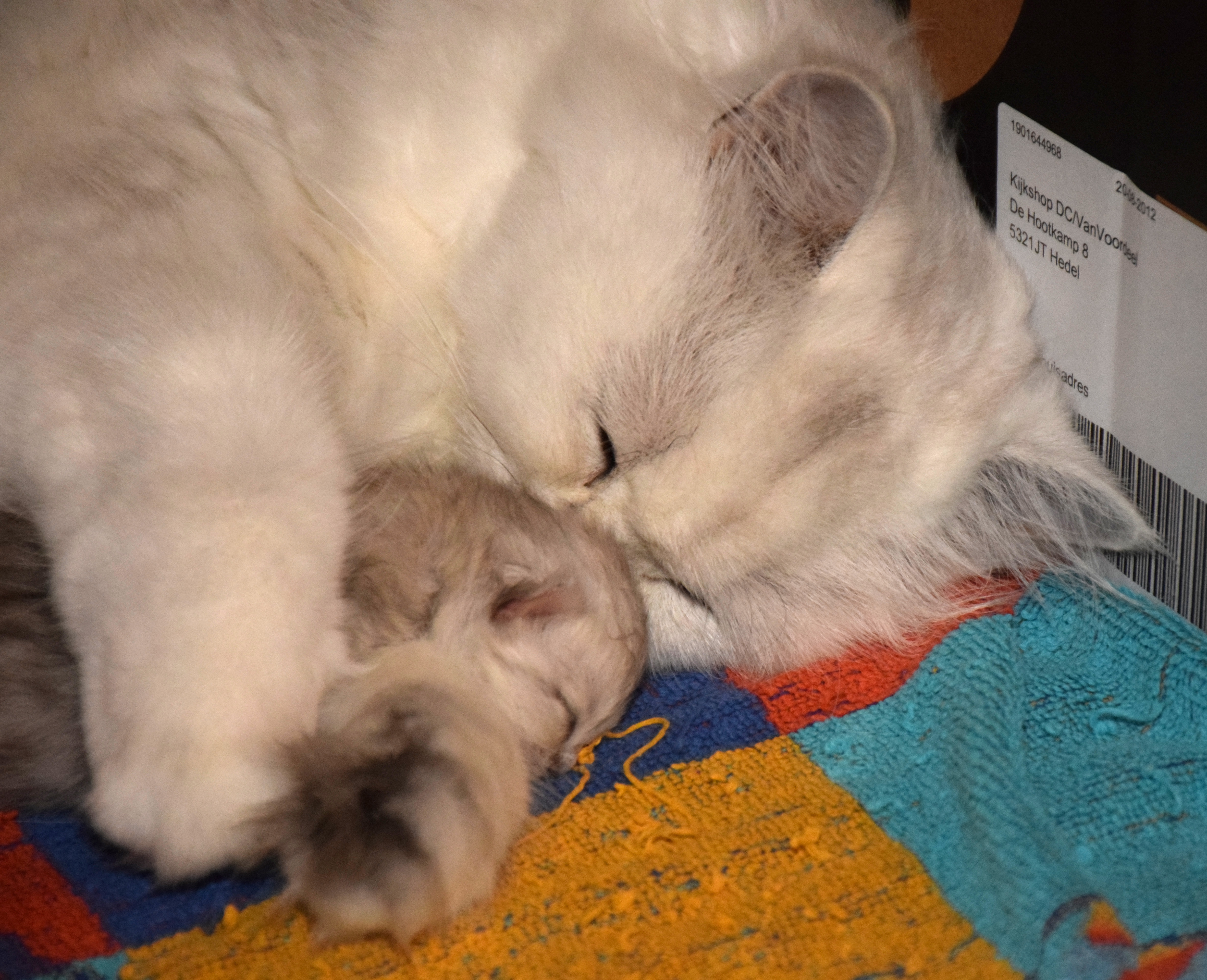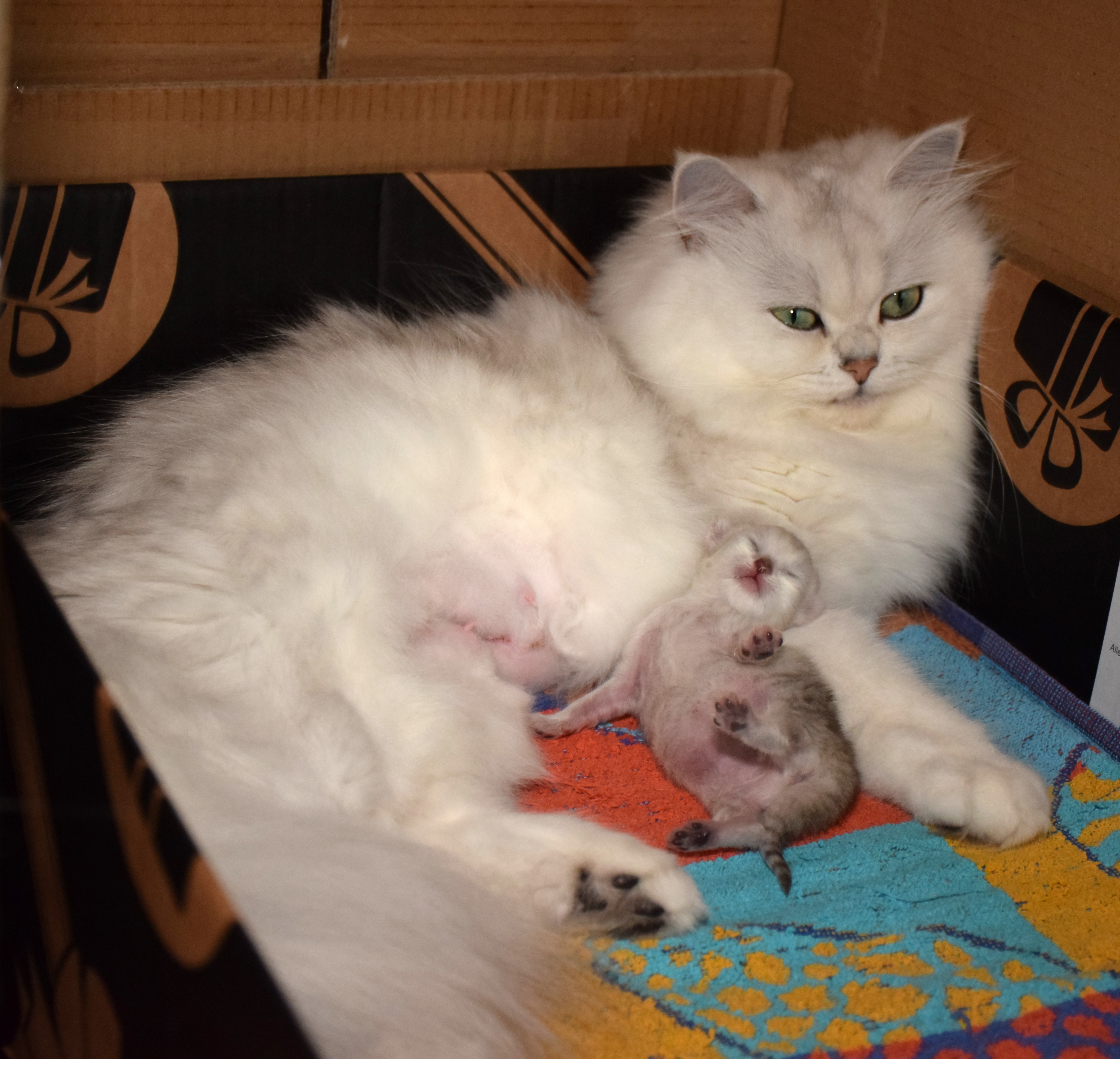 Gistermiddag, 15 juli 2015, 13.15 uur begonnen de weeën op de 65e dag van Ushi’s zwangerschap. Ik werd door Rob naar huis geroepen en was om circa 13.40 uur thuis. Ushi was erg onrustig, maar lag wel in de bevallingsdoos. Die hebben we op de bank gezet, zodat we er goed bij konden, mocht ze hulp nodig hebben. Ze vond het heerlijk als een van ons de hand op haar buik legde. Ze omarmde ons gewoon. Na een half uurtje zagen we een blaas verschijnen. Ushi had zo’n pijn dat ze regelmatig uit de doos wilde klimmen om van de pijn weg te vluchten. Om 14.45 uur ging ze zich wassen en al snel brak het vlies, waar verder niets in zat. Toen werd het stil… ze ademde veel, was onrustig, maar had eigenlijk geen weeën. Af en toe sprong ze op en wilde uit de doos en had zichtbaar pijn. Toen er om 15.45 uur nog geen activiteit was, hebben we toch maar naar de dierenarts gebeld, waar we meteen terecht konden. Tijdens het toucheren voelde de dierenarts dat het geboortekanaal heel nauw was en ze voelde het kopje van een kitten. Haar conclusie was dat het weefsel niet zou gaan verzachten. Om een en ander zeker te weten werd een tweede dierenarts gevraagd om ook nog te kijken en hij kreeg nauwelijks het topje van zijn vinger in haar vulva. Conclusie: keizersnede. Ushi werd voorbereid voor de operatie en omdat ze zo vol zat met adrenaline was het heel moeilijk om haar onder zeil te krijgen. Uiteindelijk lukte dit toch en kon de operatie beginnen. Wij mochten vanaf een zijraam meekijken (de O.K. is te klein om daar met zijn allen in te staan). Het eerste kitten werd gehaald en werd na een tijdje bij ons gebracht. Het tweede kitten werd gehaald en door de blik in de ogen van de dierenarts en de reactie van de assistentes wisten we al dat er iets niet goed was. Het derde kitten werd gehaald en na inspanning van de assistentes werd dit ook opzij gelegd, evenals het vierde kitten. De assistente kwam ons al snel vertellen dat twee van die drie kittens direct overleden na geboorte en dat ze het derde moesten euthanaseren omdat de ingewanden uit het lichaampje lagen. Wat een shock!!! Terwijl de dierenarts Ushi weer netjes dichtmaakte legden de assistente de overleden kittens voor de raam neer. Pfff… verschrikkelijk hoor. Het was ons droomnest: 1 poesje shaded silver, 1 poesje shaded golden, 1 katertje shaded silver en 1 katertje shaded golden. Alleen het eerste shaded silver poesje heeft het gered. Na overleg met de dierenarts lijkt het hem een ongelukkige samenloop van een genetische mismatch tussen de vader en Ushi. Toen Ushi een beetje bijkwam snuffelde ze aan haar kleintje en pruttelde tegen haar… zo lief dat de tranen in mijn ogen kwamen. Even daarna zag ik dat Ushi erg begon te rillen en hebben ze een verwarmingsmatje onder haar gelegd en met warm water gevulde handschoenen tegen haar aan gelegd. Een lekkere dikke handdoek over haar heen en langzaam maar zeker warmde ze wat op. Het kitten hebben we bij haar gelegd, maar dit wilde nog geen tepel accepteren. Tegen 18.30 uur zijn we met onze schat naar huis gegaan. Ushi was nog erg apathisch en het kleintje wilde geen enkele tepel accepteren. Om circa 20.00 uur begon Ushi wat bij te komen en een half uurtje later lukte het eindelijk om het kitten bij haar aan te leggen. Maar Ushi besefte nog niet goed dat dit haar kindje is. Afgelopen nacht heb ik naast de bench gebivakkeerd om een en ander in de gaten te houden. Dus nauwelijks geslapen, maar ik heb het er voor over. Vanmorgen was het kitten al 11 gram aangekomen, de moederdrift van Ushi komt op gang, maar pffff… wat heeft ze een hulp nodig.. arm beestje. Inmiddels hebben we een knuffel als surrogaatmoeder geïnstalleerd voor als Ushi even de bench uitgaat. Het komt allemaal goed, maar duurt even… 🙂