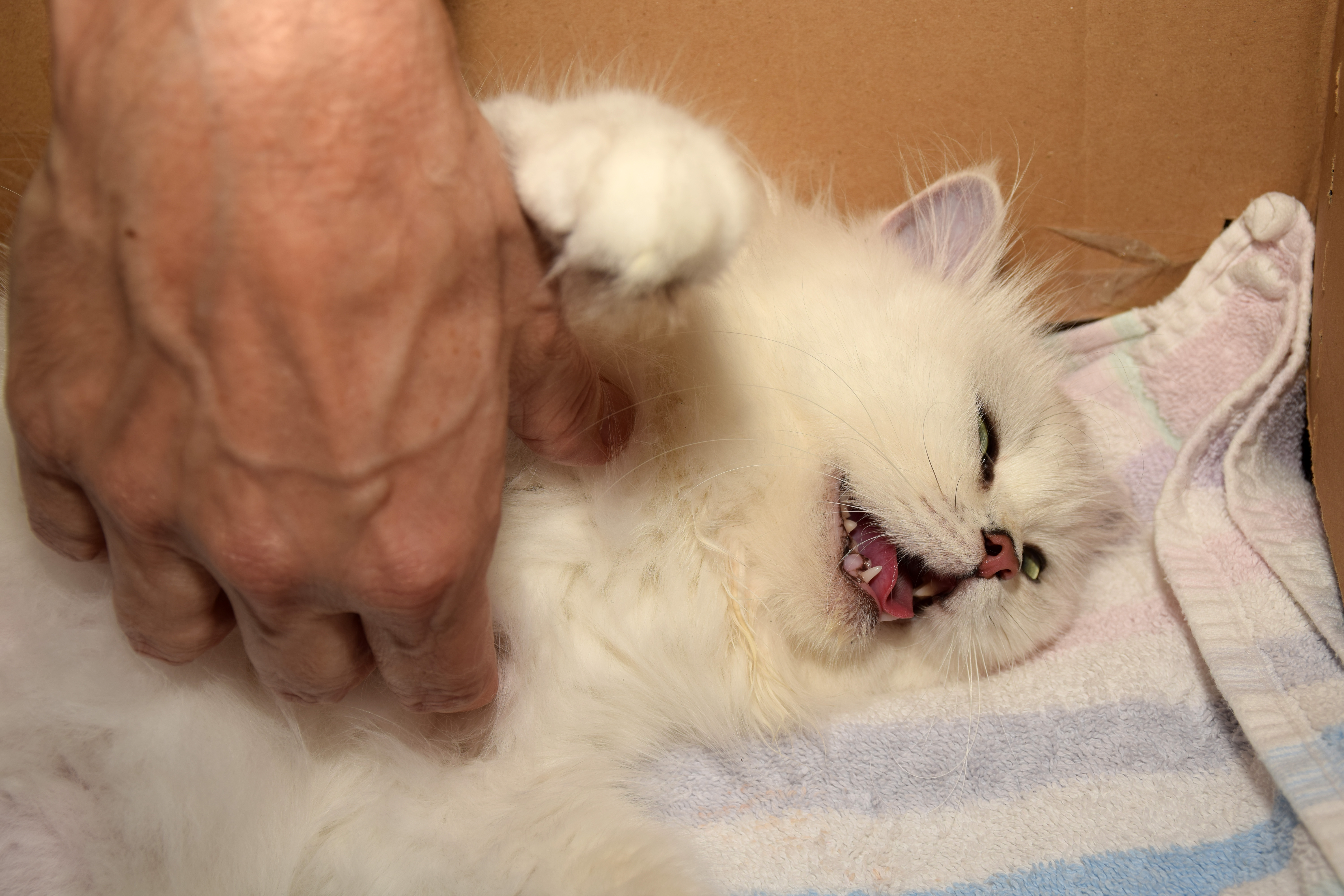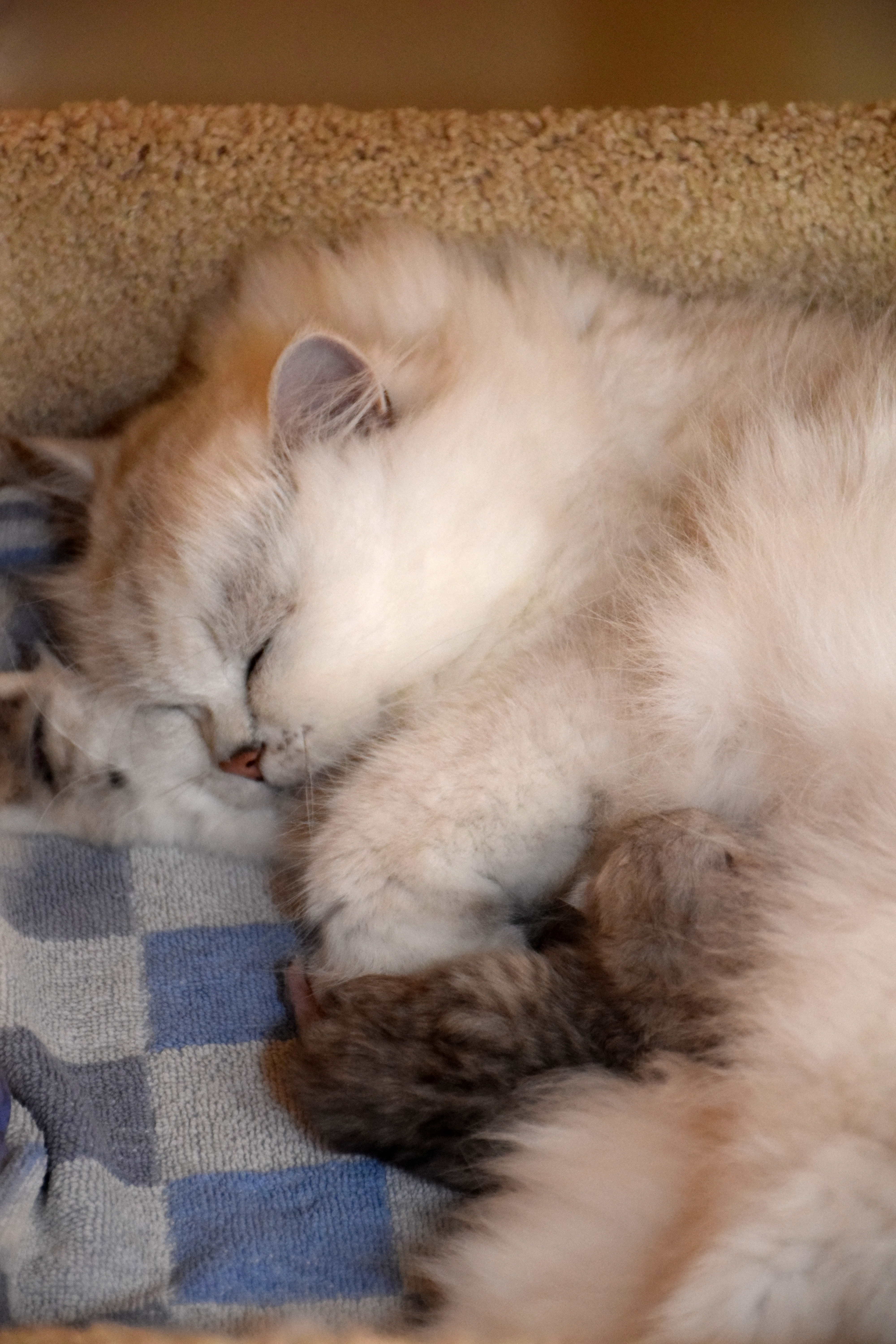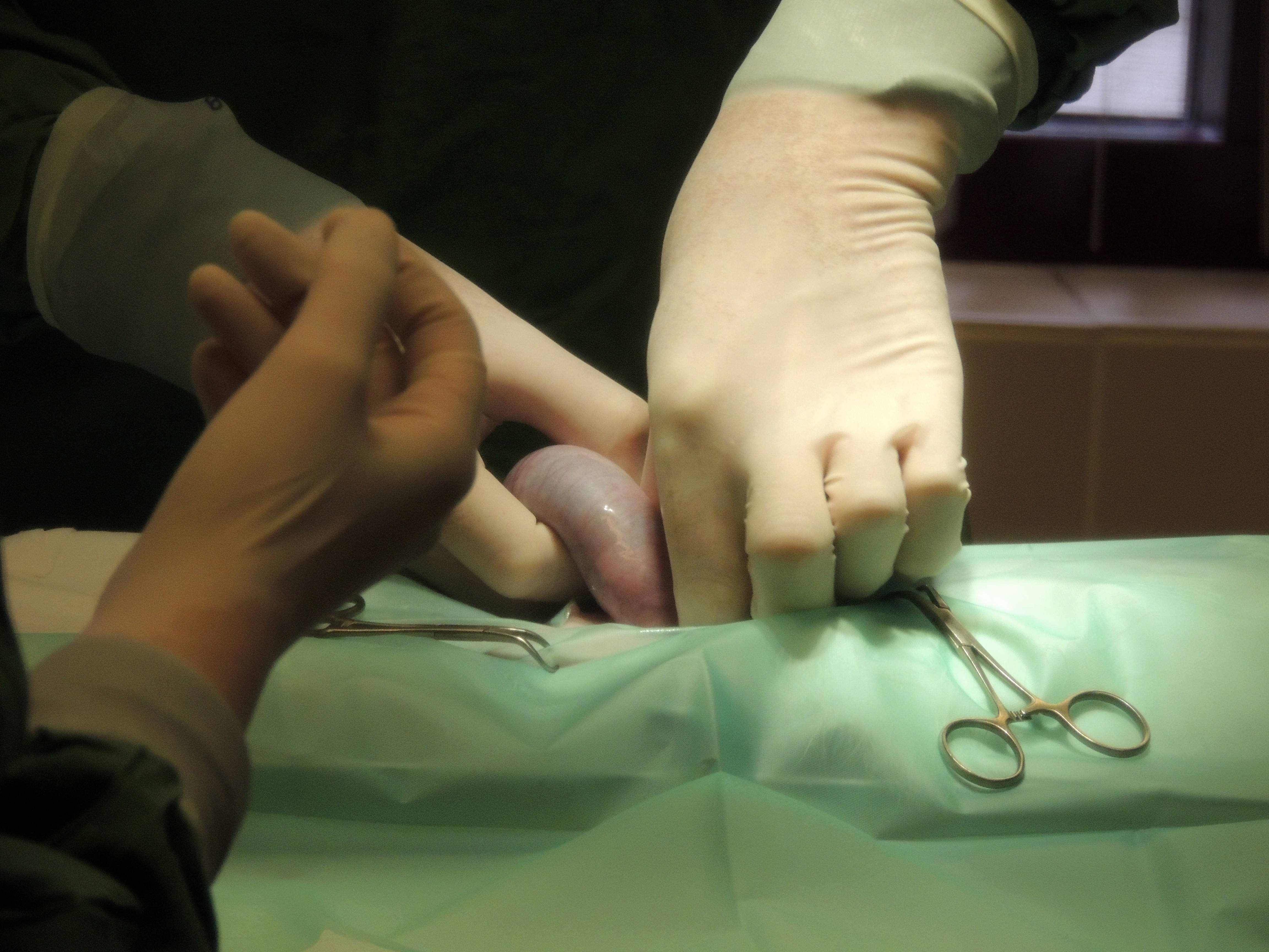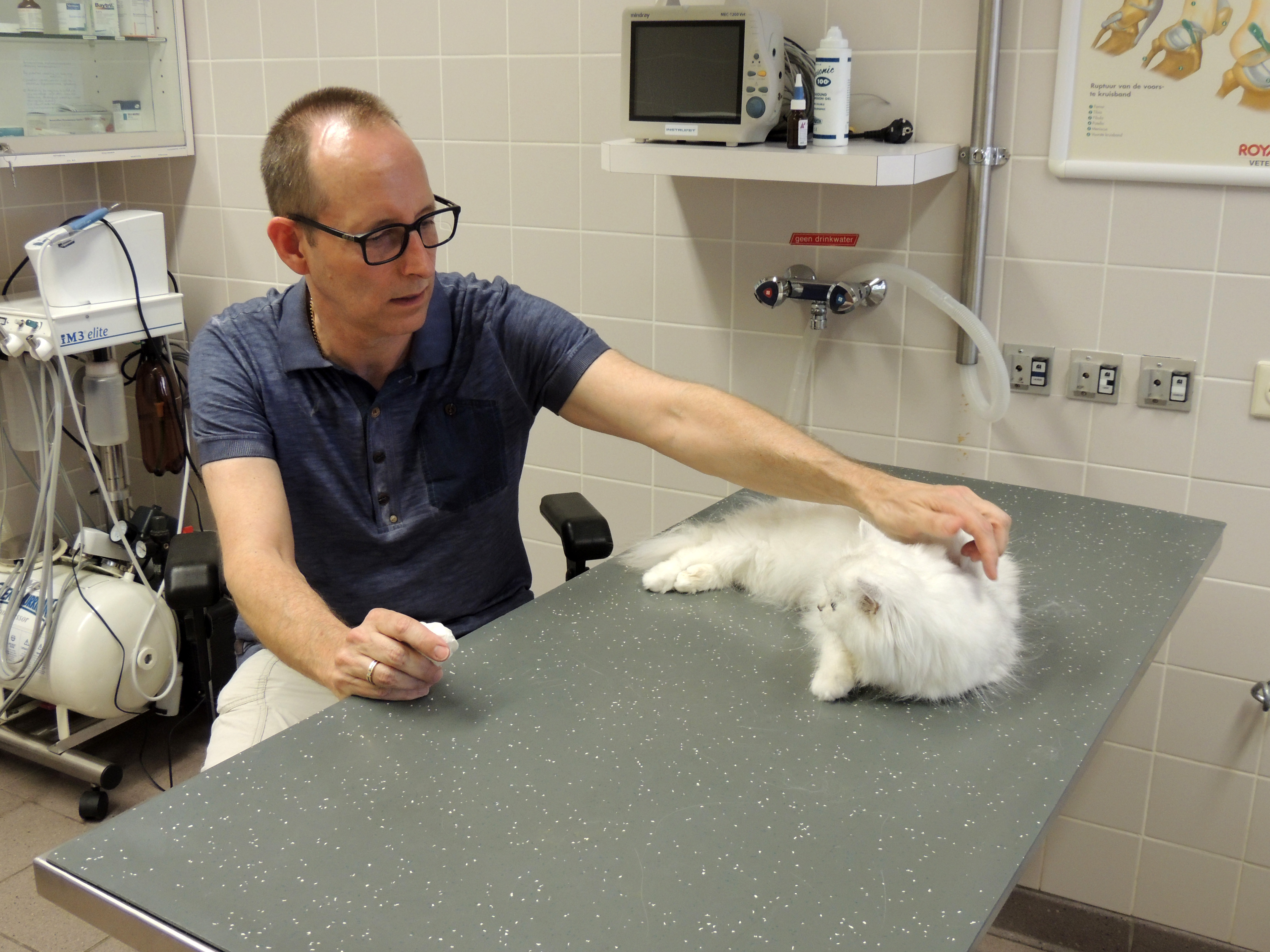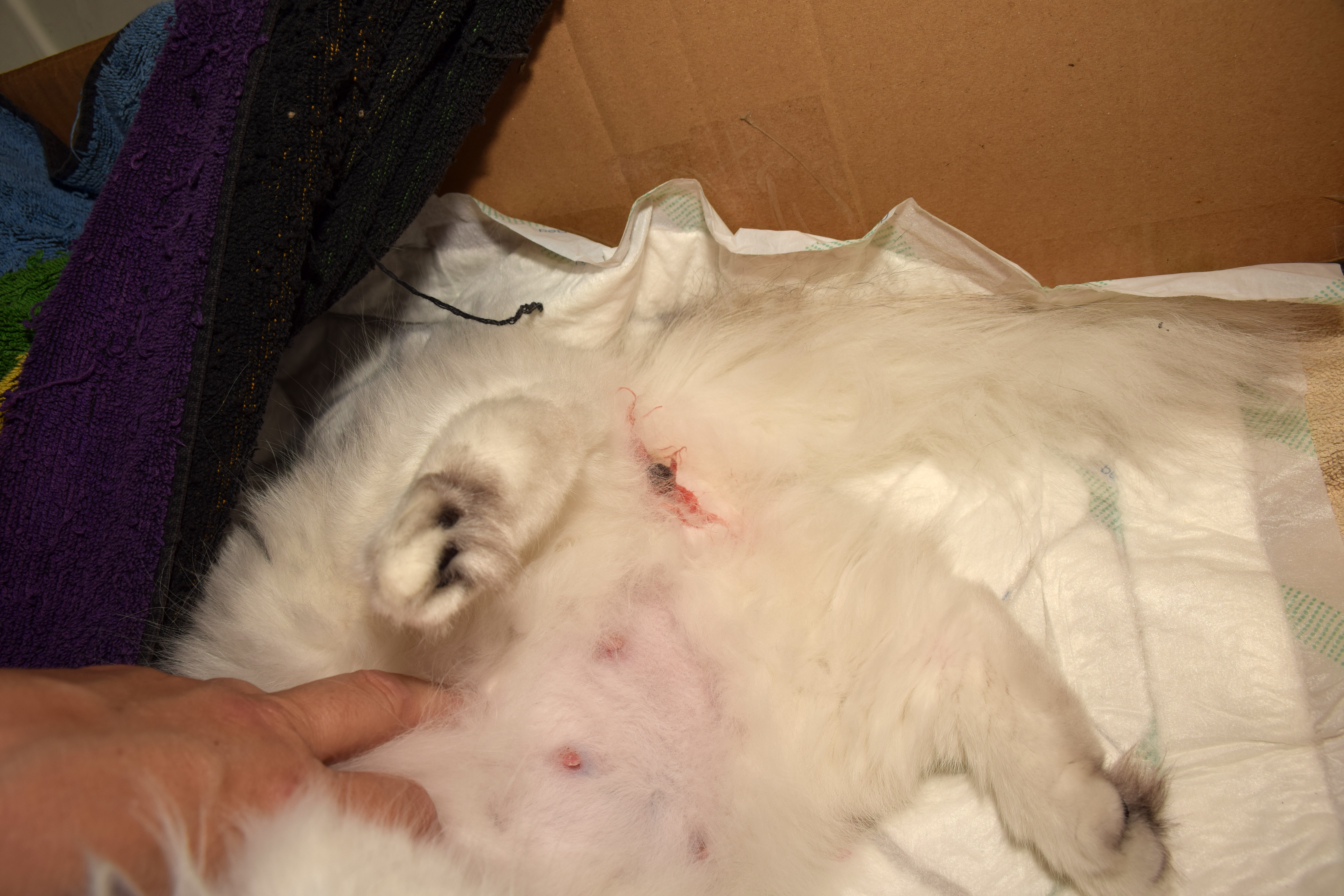 Gistermiddag, 15 juli 2015, 13.15 uur begonnen de weeën op de 65e dag van Ushi’s zwangerschap. Ik werd door Rob naar huis geroepen en was om circa 13.40 uur thuis. Ushi was erg onrustig, maar lag wel in de bevallingsdoos. Die hebben we op de bank gezet, zodat we er goed bij konden, mocht ze hulp nodig hebben. Ze vond het heerlijk als een van ons de hand op haar buik legde. Ze omarmde ons gewoon. Na een half uurtje zagen we een blaas verschijnen. Ushi had zo’n pijn dat ze regelmatig uit de doos wilde klimmen om van de pijn weg te vluchten. Om 14.45 uur ging ze zich wassen en al snel brak het vlies, waar verder niets in zat. Toen werd het stil… ze ademde veel, was onrustig, maar had eigenlijk geen weeën. Af en toe sprong ze op en wilde uit de doos en had zichtbaar pijn. Toen er om 15.45 uur nog geen activiteit was, hebben we toch maar naar de dierenarts gebeld, waar we meteen terecht konden. Tijdens het toucheren voelde de dierenarts dat het geboortekanaal heel nauw was en ze voelde het kopje van een kitten. Haar conclusie was dat het weefsel niet zou gaan verzachten. Om een en ander zeker te weten werd een tweede dierenarts gevraagd om ook nog te kijken en hij kreeg nauwelijks het topje van zijn vinger in haar vulva. Conclusie: keizersnede. Ushi werd voorbereid voor de operatie en omdat ze zo vol zat met adrenaline was het heel moeilijk om haar onder zeil te krijgen. Uiteindelijk lukte dit toch en kon de operatie beginnen. Wij mochten vanaf een zijraam meekijken (de O.K. is te klein om daar met zijn allen in te staan). Het eerste kitten werd gehaald en werd na een tijdje bij ons gebracht. Het tweede kitten werd gehaald en door de blik in de ogen van de dierenarts en de reactie van de assistentes wisten we al dat er iets niet goed was. Het derde kitten werd gehaald en na inspanning van de assistentes werd dit ook opzij gelegd, evenals het vierde kitten. De assistente kwam ons al snel vertellen dat twee van die drie kittens direct overleden na geboorte en dat ze het derde moesten euthanaseren omdat de ingewanden uit het lichaampje lagen. Wat een shock!!! Terwijl de dierenarts Ushi weer netjes dichtmaakte legden de assistente de overleden kittens voor de raam neer. Pfff… verschrikkelijk hoor. Het was ons droomnest: 1 poesje shaded silver, 1 poesje shaded golden, 1 katertje shaded silver en 1 katertje shaded golden. Alleen het eerste shaded silver poesje heeft het gered. Na overleg met de dierenarts lijkt het hem een ongelukkige samenloop van een genetische mismatch tussen de vader en Ushi. Toen Ushi een beetje bijkwam snuffelde ze aan haar kleintje en pruttelde tegen haar… zo lief dat de tranen in mijn ogen kwamen. Even daarna zag ik dat Ushi erg begon te rillen en hebben ze een verwarmingsmatje onder haar gelegd en met warm water gevulde handschoenen tegen haar aan gelegd. Een lekkere dikke handdoek over haar heen en langzaam maar zeker warmde ze wat op. Het kitten hebben we bij haar gelegd, maar dit wilde nog geen tepel accepteren. Tegen 18.30 uur zijn we met onze schat naar huis gegaan. Ushi was nog erg apathisch en het kleintje wilde geen enkele tepel accepteren. Om circa 20.00 uur begon Ushi wat bij te komen en een half uurtje later lukte het eindelijk om het kitten bij haar aan te leggen. Maar Ushi besefte nog niet goed dat dit haar kindje is. Afgelopen nacht heb ik naast de bench gebivakkeerd om een en ander in de gaten te houden. Dus nauwelijks geslapen, maar ik heb het er voor over. Vanmorgen was het kitten al 11 gram aangekomen, de moederdrift van Ushi komt op gang, maar pffff… wat heeft ze een hulp nodig.. arm beestje. Inmiddels hebben we een knuffel als surrogaatmoeder geïnstalleerd voor als Ushi even de bench uitgaat. Het komt allemaal goed, maar duurt even… 🙂