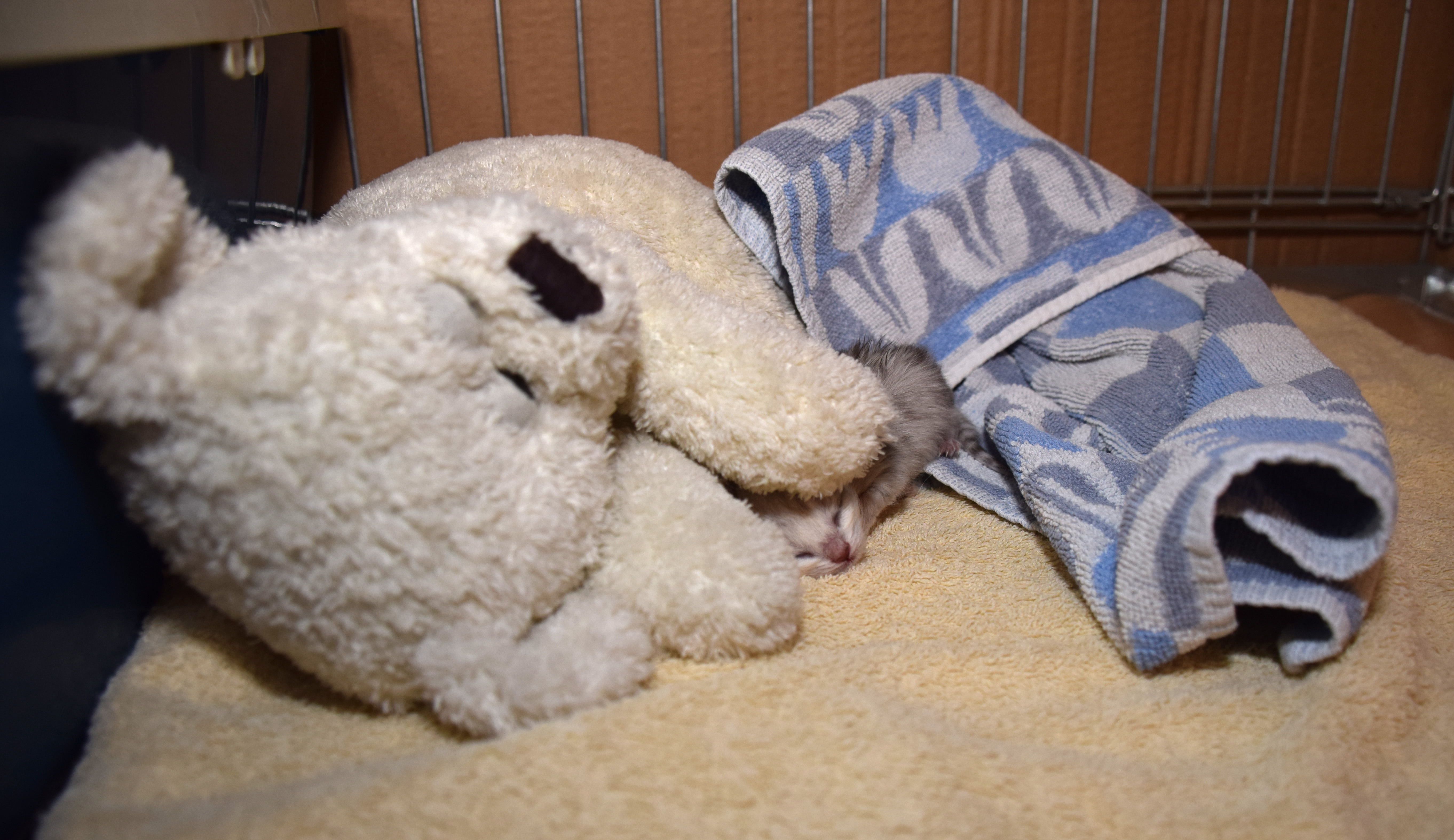 Ik weet eigenlijk niet goed hoe ik dit bericht moet beginnen. Na bijna een week genieten van ons kleine wondertje Trinity, is daar vandaag een abrupt einde aan gekomen. Toen ik voor de lunch thuis kwam vertelde Rob dat ze niet wilde drinken en een “roggeltje” bij zich had. Ondanks dat we morgen een controle afspraak bij de dierenarts hebben staan voor Ushi, leek het ons niet verstandig zolang te wachten en hebben we meteen gebeld. We konden direct terecht. Trinity werd door de DA onderzocht en hij vond dat ze een erg dikke buik had (was mij ook al opgevallen). Hij hoorde ook geen normale darmactiviteiten. Met de darmproblemen van haar broertjes en zusje in het achterhoofd, werd een collega gevraagd ook eens te kijken. Ook zij constateerde dat het buikje niet normaal aanvoelde en er is in overleg met ons besloten om een röntgenfoto te maken. Hierop was duidelijk te zien dat de buik behoorlijk vol zat en dat de darmen er niet normaal uit zagen. Ook werd door het dikke buikje het middenrif zover naar boven geduwd dat de longen in het gedrang kwamen. Om nog een beter beeld te krijgen van de maag-/darmomgeving is ook nog een echo gemaakt. Hierop was ook duidelijk te zien dat er het een en ander niet goed was in haar buikje. Voorzichtig werd door hen geopperd dat we over een afscheid moesten nadenken, maar op dat moment hadden we, met name ik, er geen oren naar en met wat paraffine om door te spoelen (zou misschien nog wat helpen) gingen we naar huis. Afgesproken werd dat we haar morgen sowieso weer mee zouden nemen, maar de DA drukte ons ook op het hart dat zijn collega vannacht dienst had, mocht de situatie verslechteren. Thuisgekomen ging het snel achteruit met Trinity en zijn we meteen teruggegaan om haar in te laten slapen.